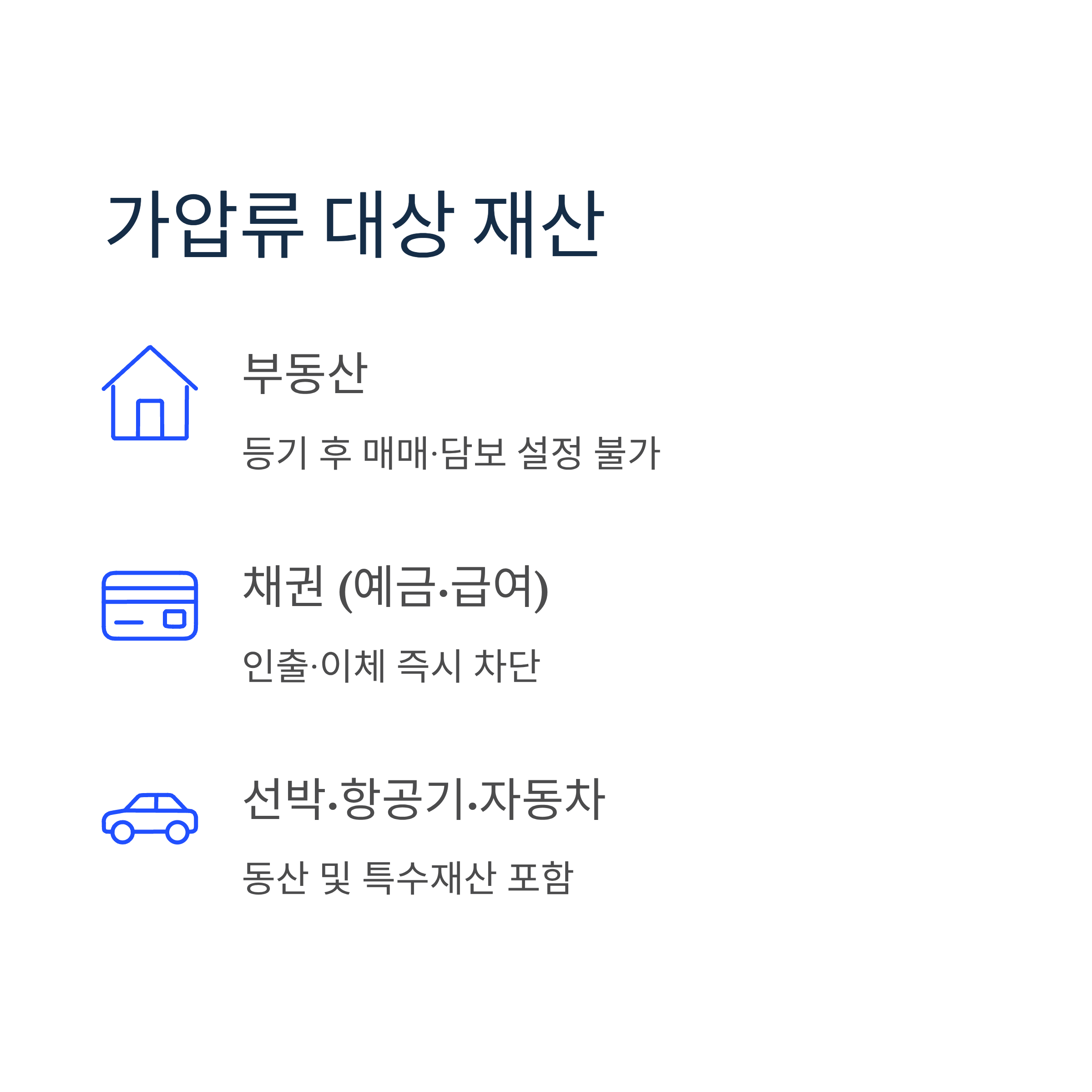 가압류의 대상이 되는 재산 종류는 다음과 같다. 실무에서 가장 많이 활용되는 것은 부동산 가압류와 채권 가압류(예금·급여)다.