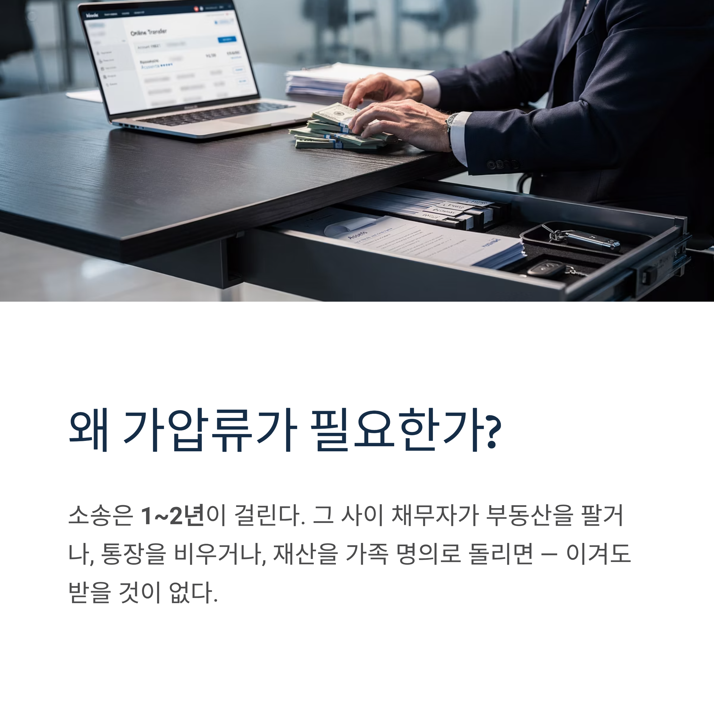 소송은 보통 1~2년이 걸린다. 그 사이에 채무자가 부동산을 팔거나, 통장을 비워버리거나, 재산을 가족 명의로 돌려버리면 막상 이겨도 받을 것이 없어진다.