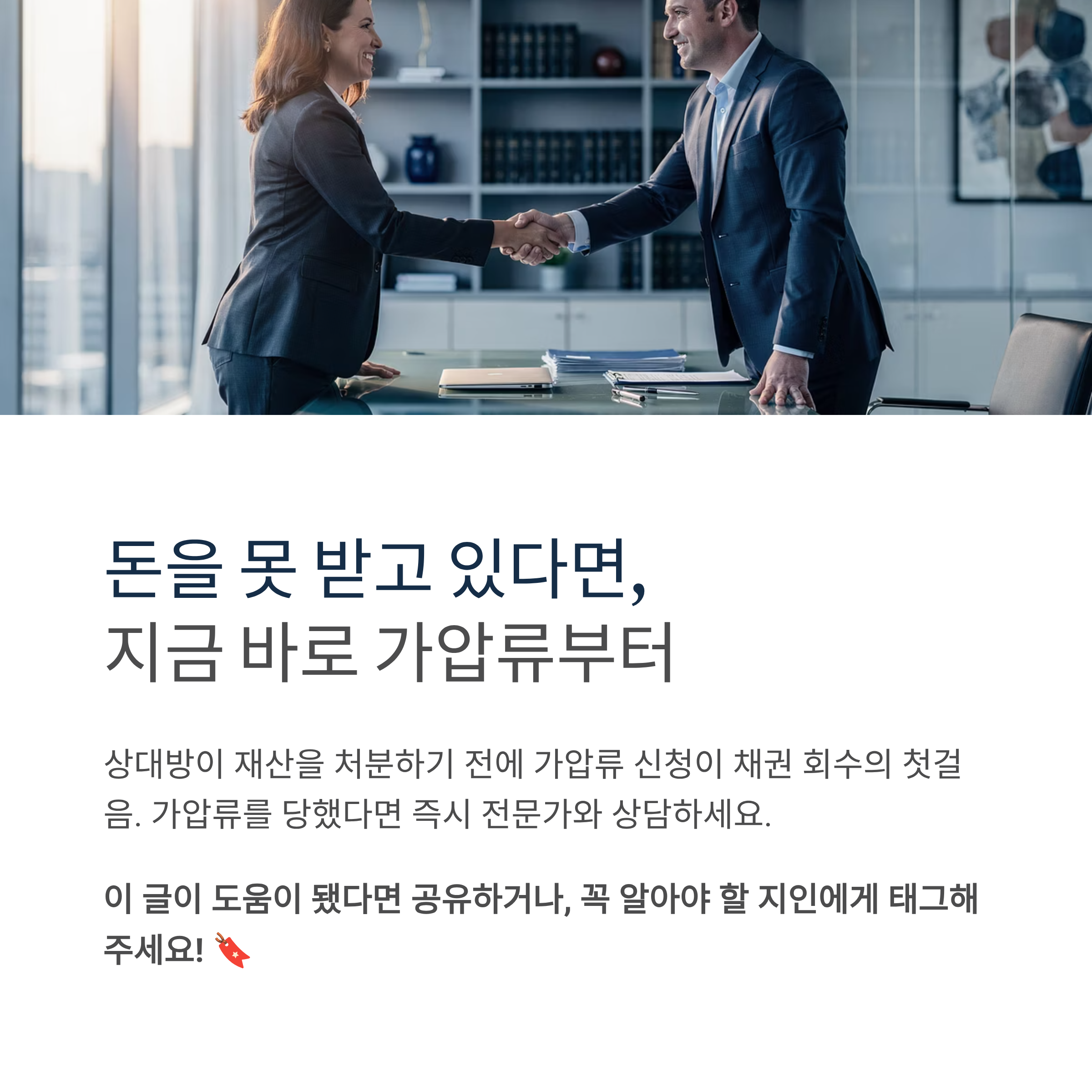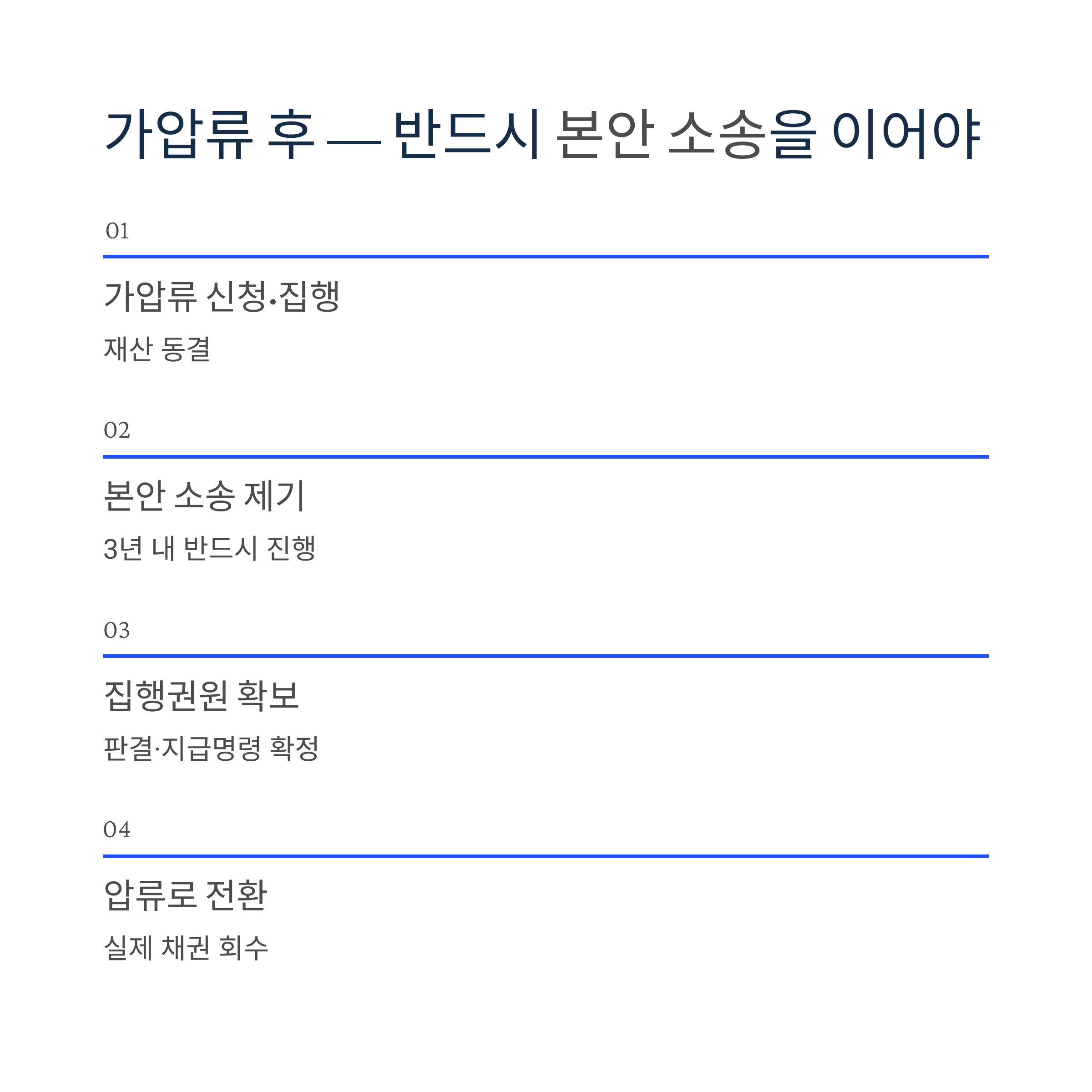 돈을 받지 못하고 있다면, 상대방이 재산을 처분하기 전에 가압류부터 신청하는 것이 채권 회수의 첫걸음이다. 가압류는 소송 없이도 신청할 수 있지만, 가압류 이후에는 반드시 3년 이내에 본안 소송 또는 지급명령을 제기해 집행권원을 확보해야 실제 돈을 받을 수 있다.