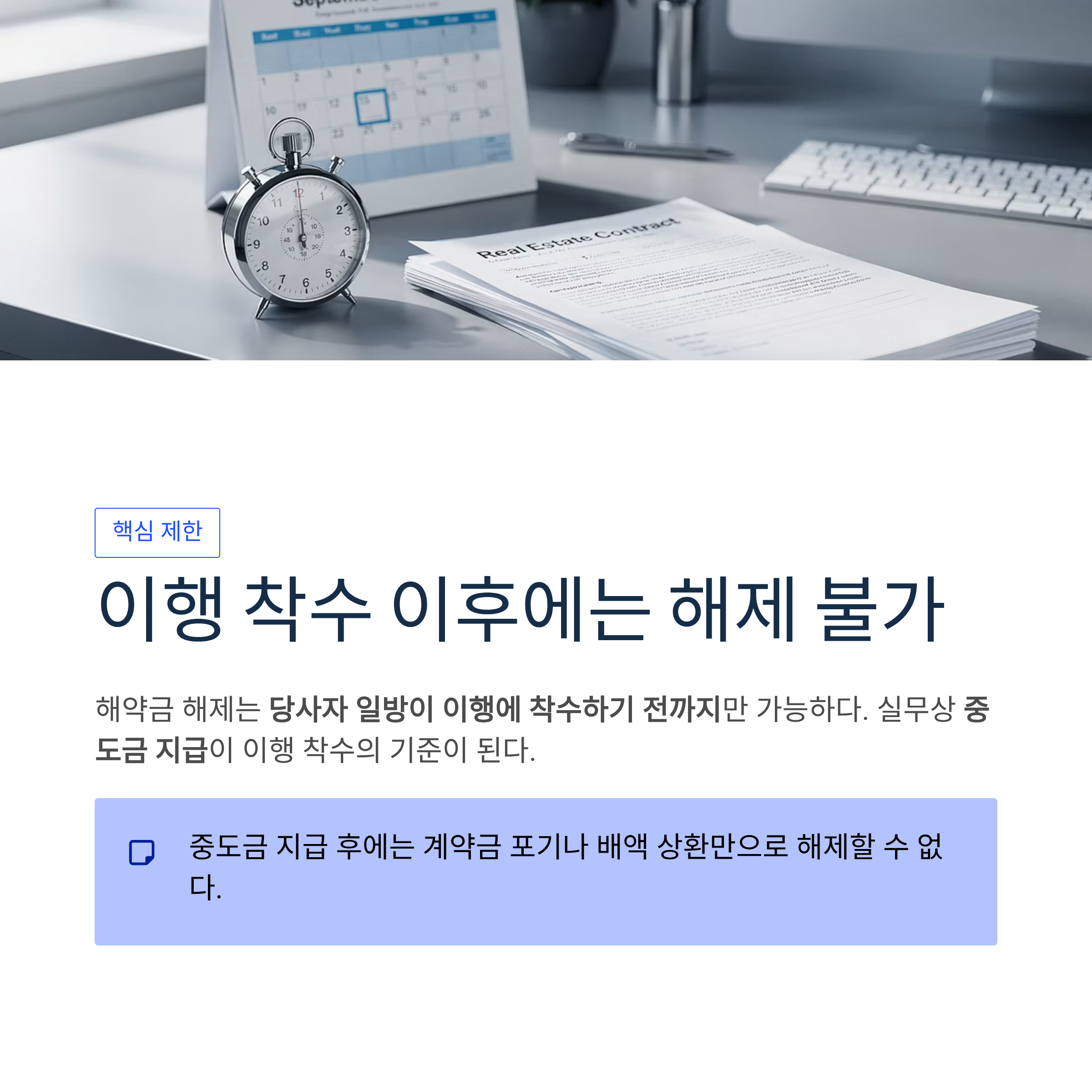 실무에서 '이행 착수'는 통상 중도금 지급을 의미한다. 매수인이 중도금을 지급했거나 매도인이 이전등기 준비를 마친 상태라면, 계약금 포기나 배액 상환만으로는 더 이상 해제할 수 없다.
