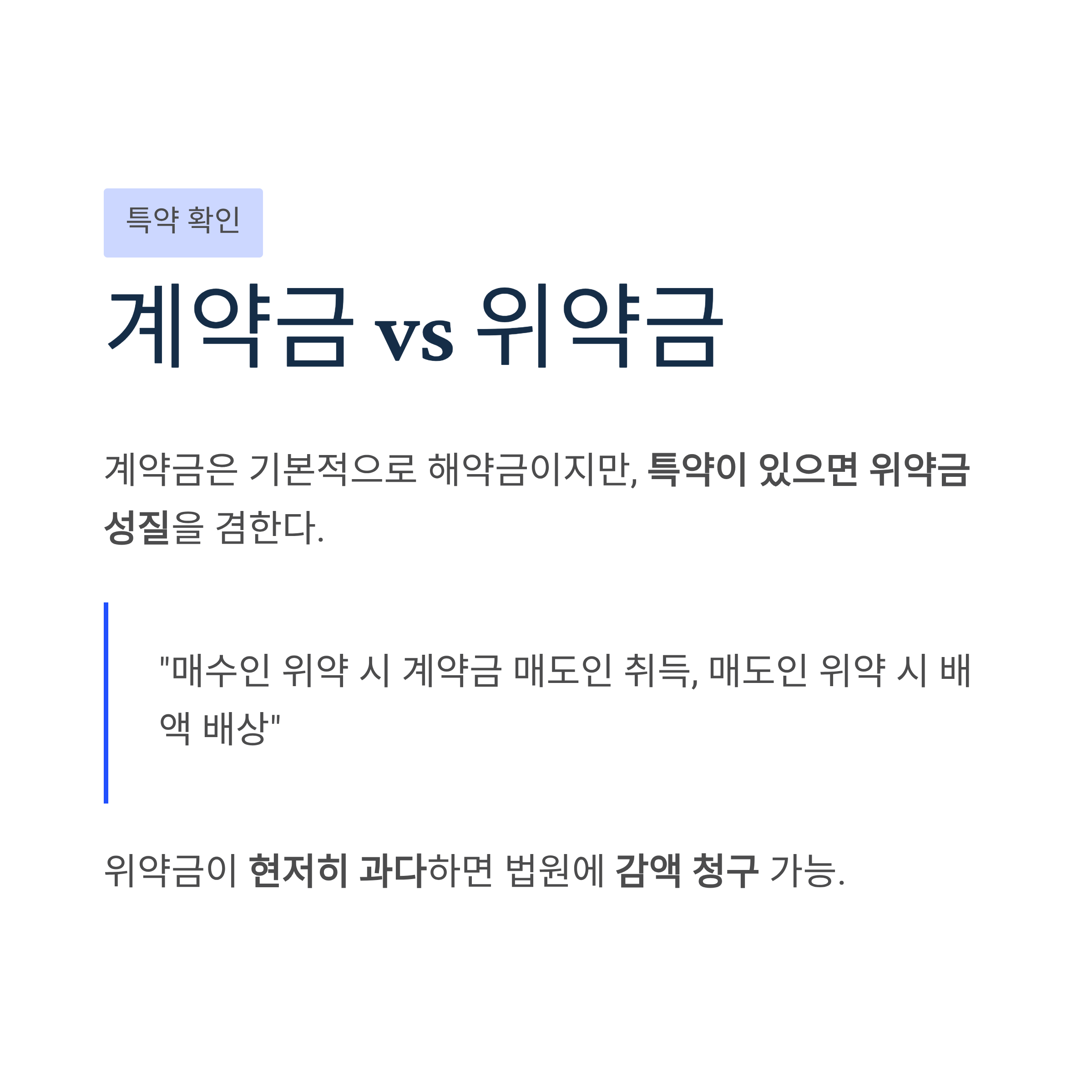 계약금은 일반적으로 해약금으로 추정되고, 특약이 있는 경우에만 위약금으로서의 성질을 가지게 된다.