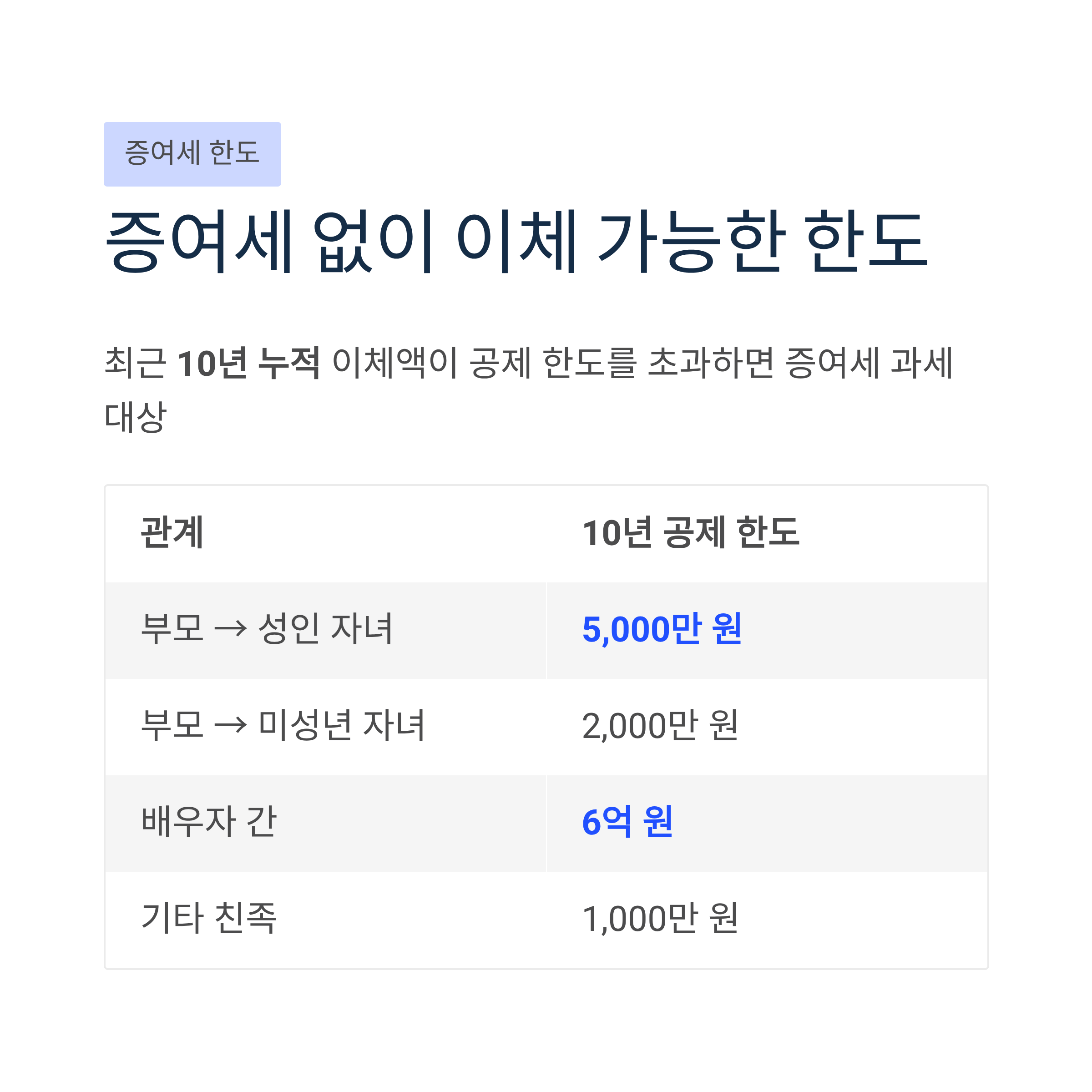- 누적 10년 누적 5,000만 원(성인 자녀) 초과 → 증여세 과세 대상
