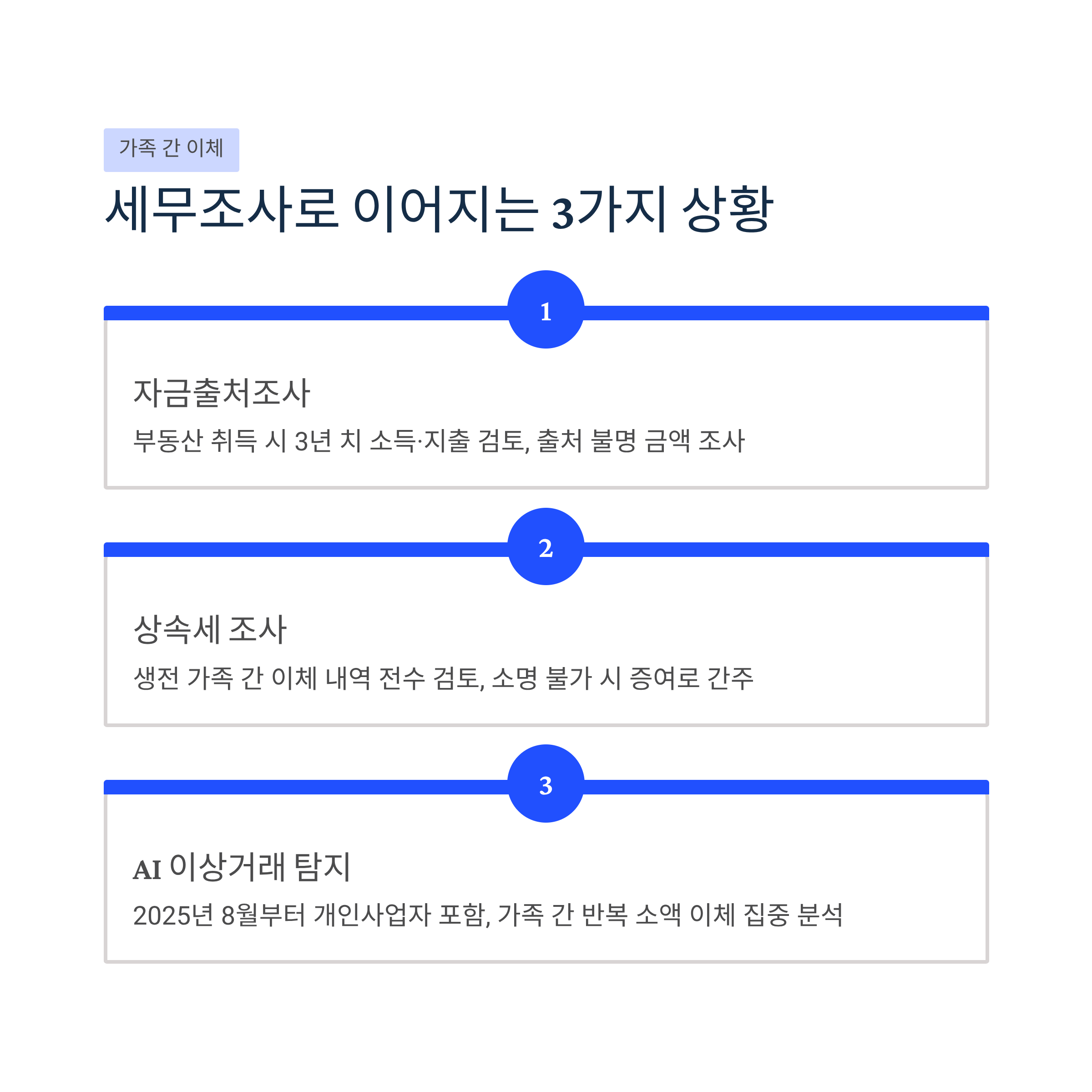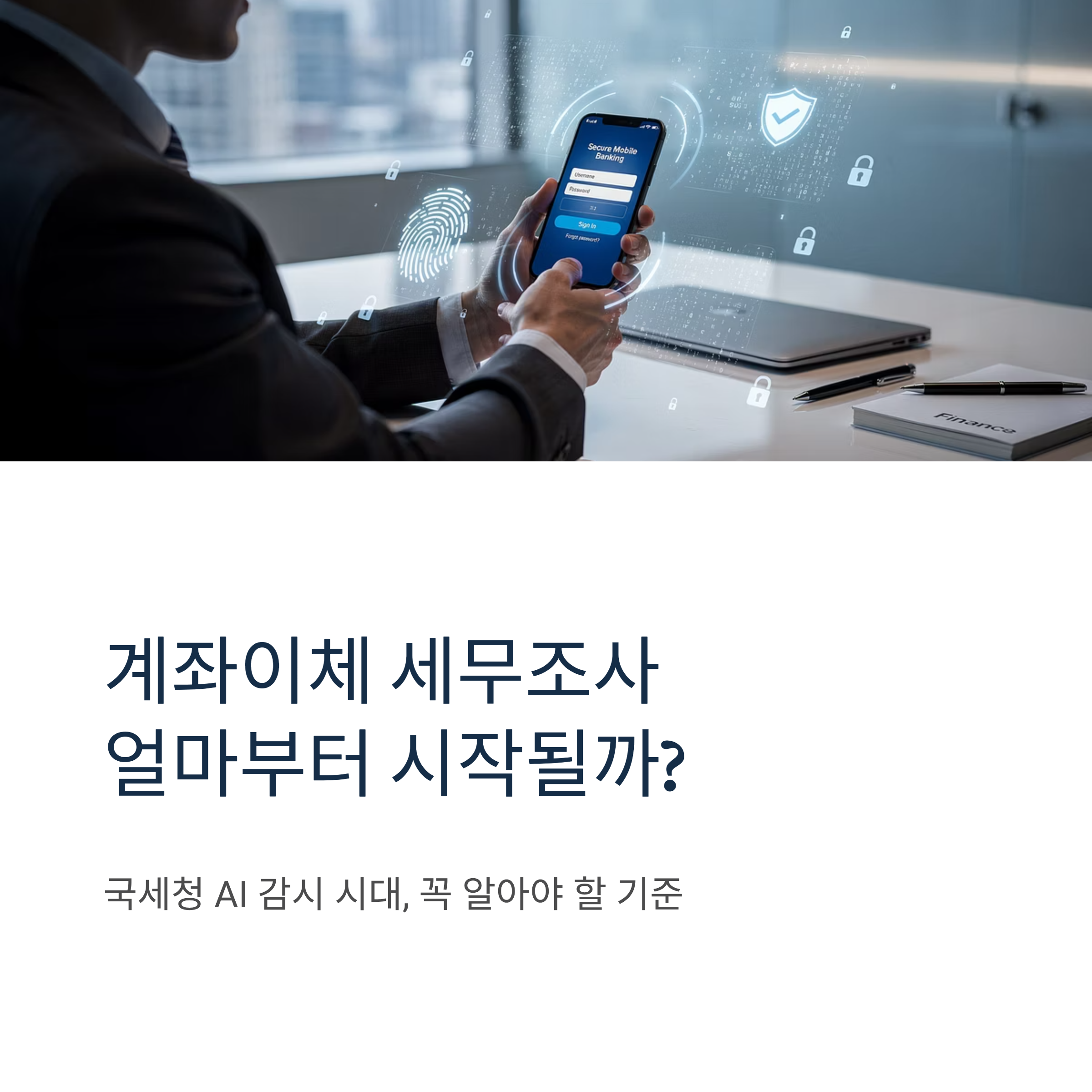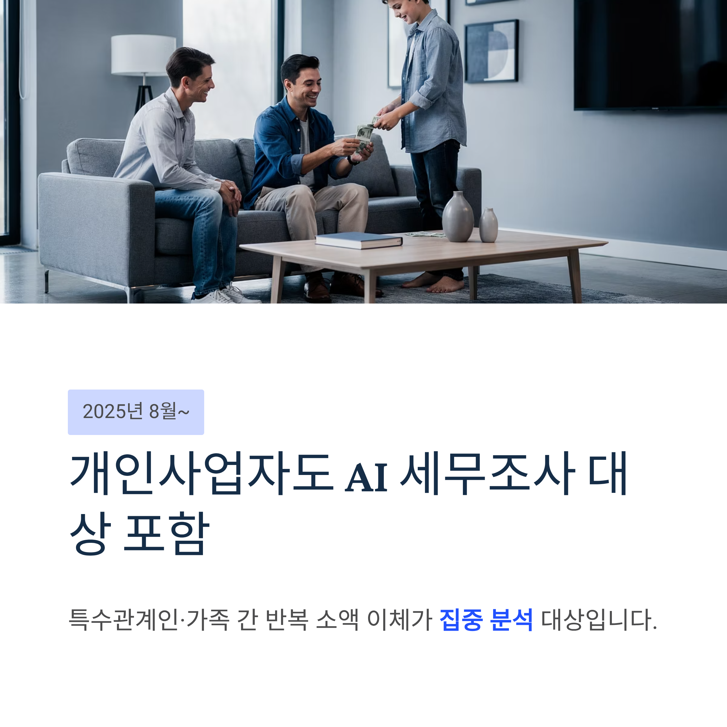 2025년 8월부터 개인사업자까지 AI 세무조사 선별 대상에 포함되었으며, 가족·특수관계인 간 반복 소액 이체가 집중 분석됩니다.