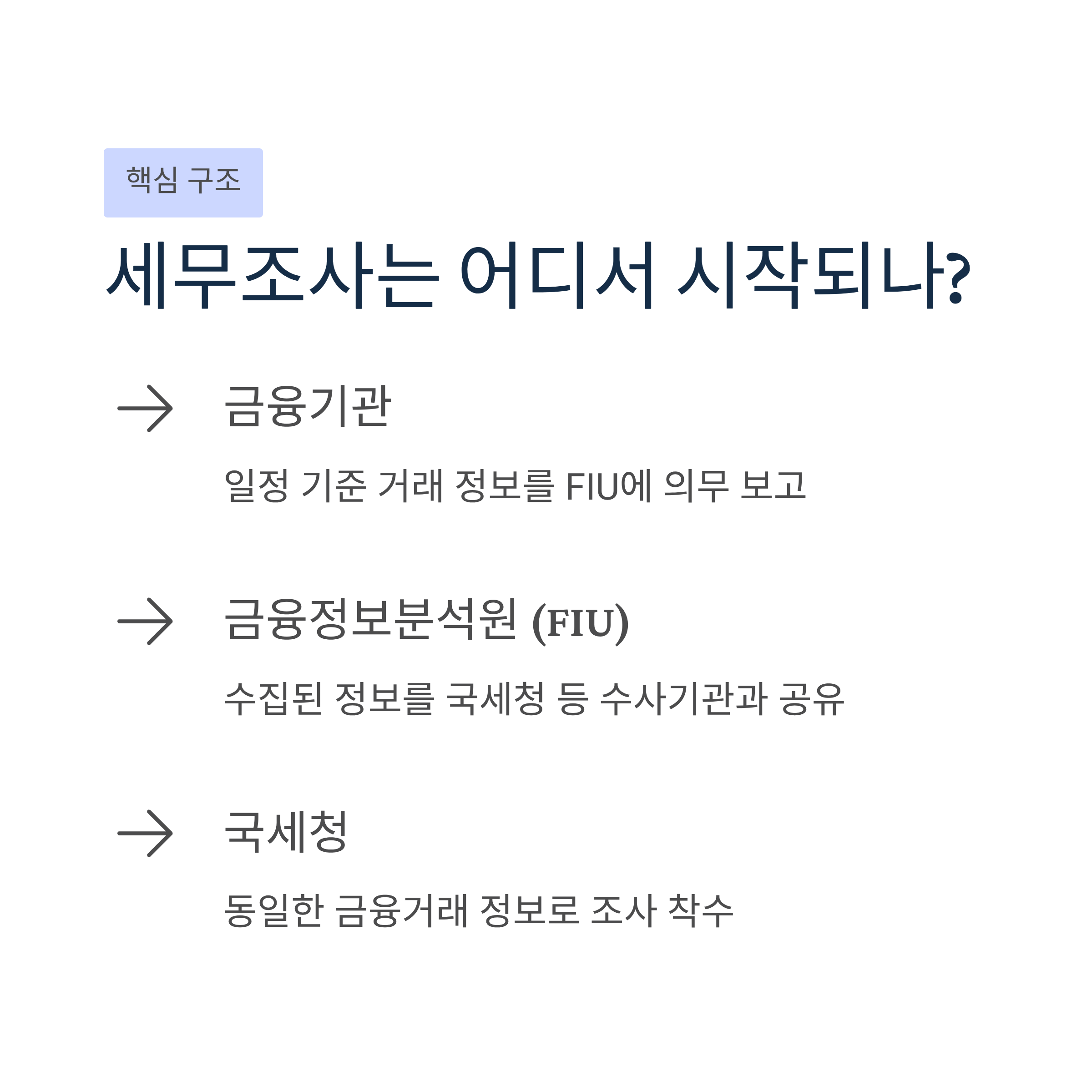 건당 1,000만 원 이상 현금 입출금은 예외 없이 FIU에 보고되며, 반복적인 소액 이체도 이상 거래로 판단될 경우 국세청에 자료가 전달됩니다.