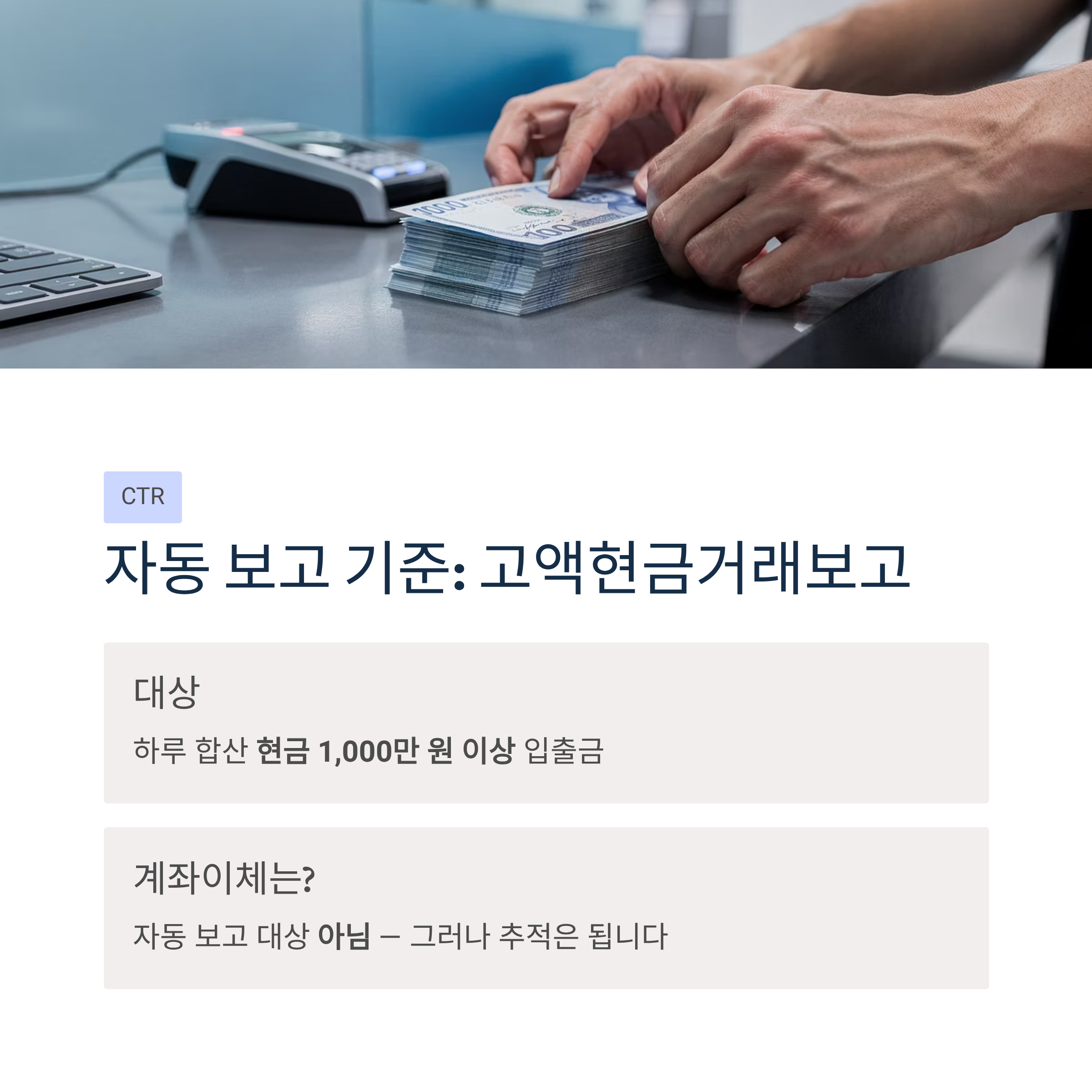 - 현금 하루 합산 1,000만 원 이상 현금 입출금 → FIU 자동 보고