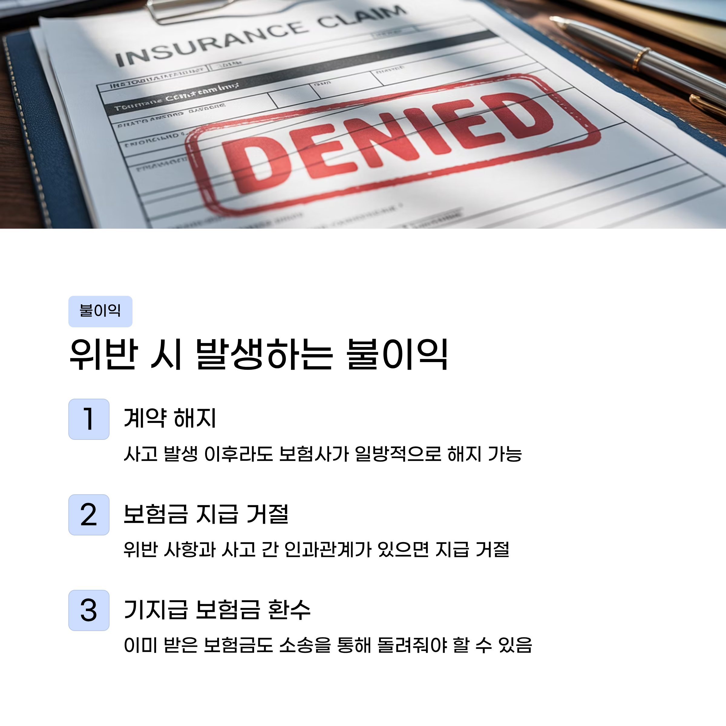 위반 사항과 사고 사이에 인과관계가 있다면 보험사는 보험금 지급을 정당하게 거절한다. 이미 지급된 보험금이 있다면 소송을 통해 환수당할 수도 있다.