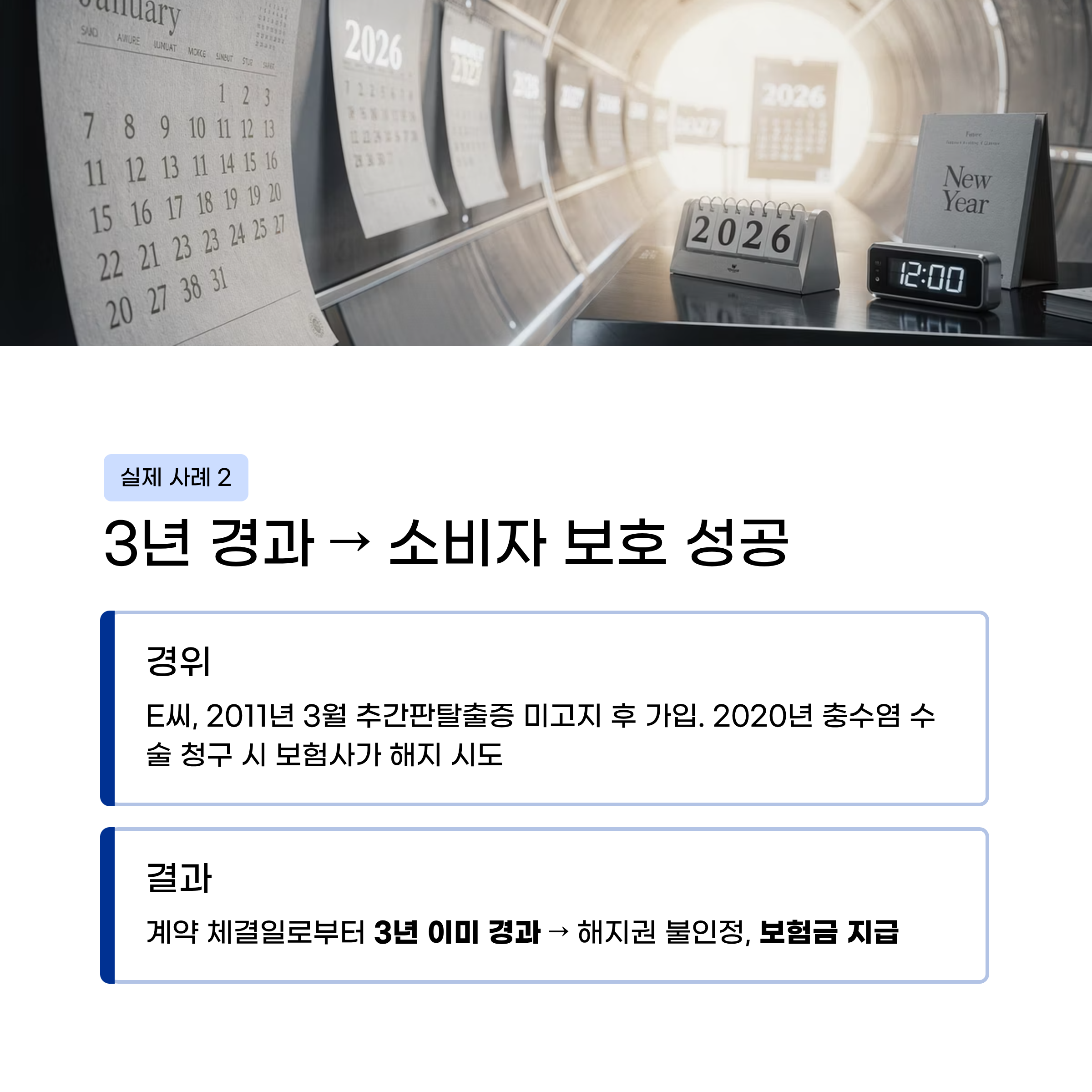 E씨는 2010년 11월 추간판탈출증을 고지하지 않고 2011년 3월 보험에 가입해 2020년 4월 충수염 수술로 보험금을 청구했다. 보험사가 고지의무 위반을 이유로 계약 해지 및 보험금 부지급을 주장했으나, 계약 체결일로부터 이미 3년이 경과해 해지권 행사가 인정되지 않아 보험금이 지급됐다.