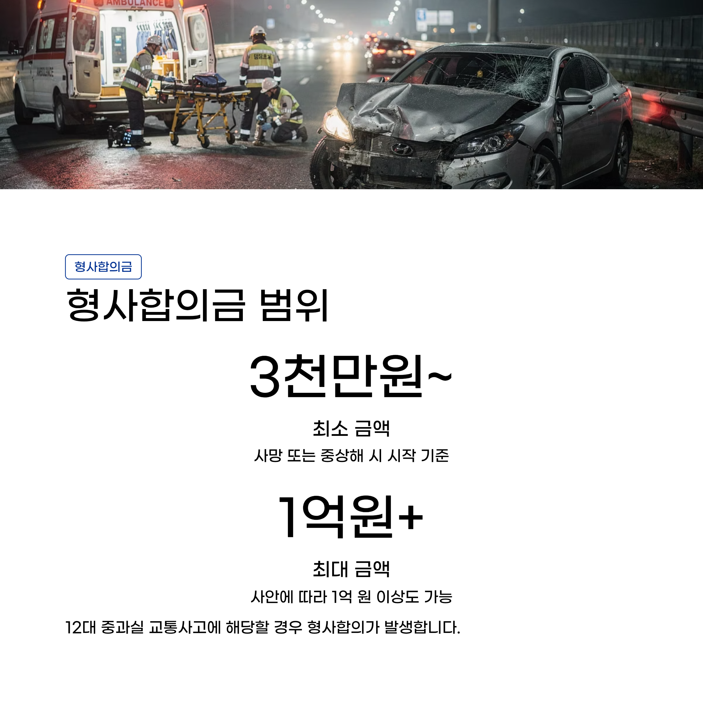 가해자가 12대 중과실(신호위반, 중앙선 침범, 스쿨존 사고 등)에 해당하는 교통사고를 일으킨 경우 형사처벌을 면하기 위해 지급하는 금액입니다. 피해자 사망 또는 중상해 시 최소 3천만 원부터 시작하며, 최근에는 5천만 원~1억 원 이상도 흔합니다.