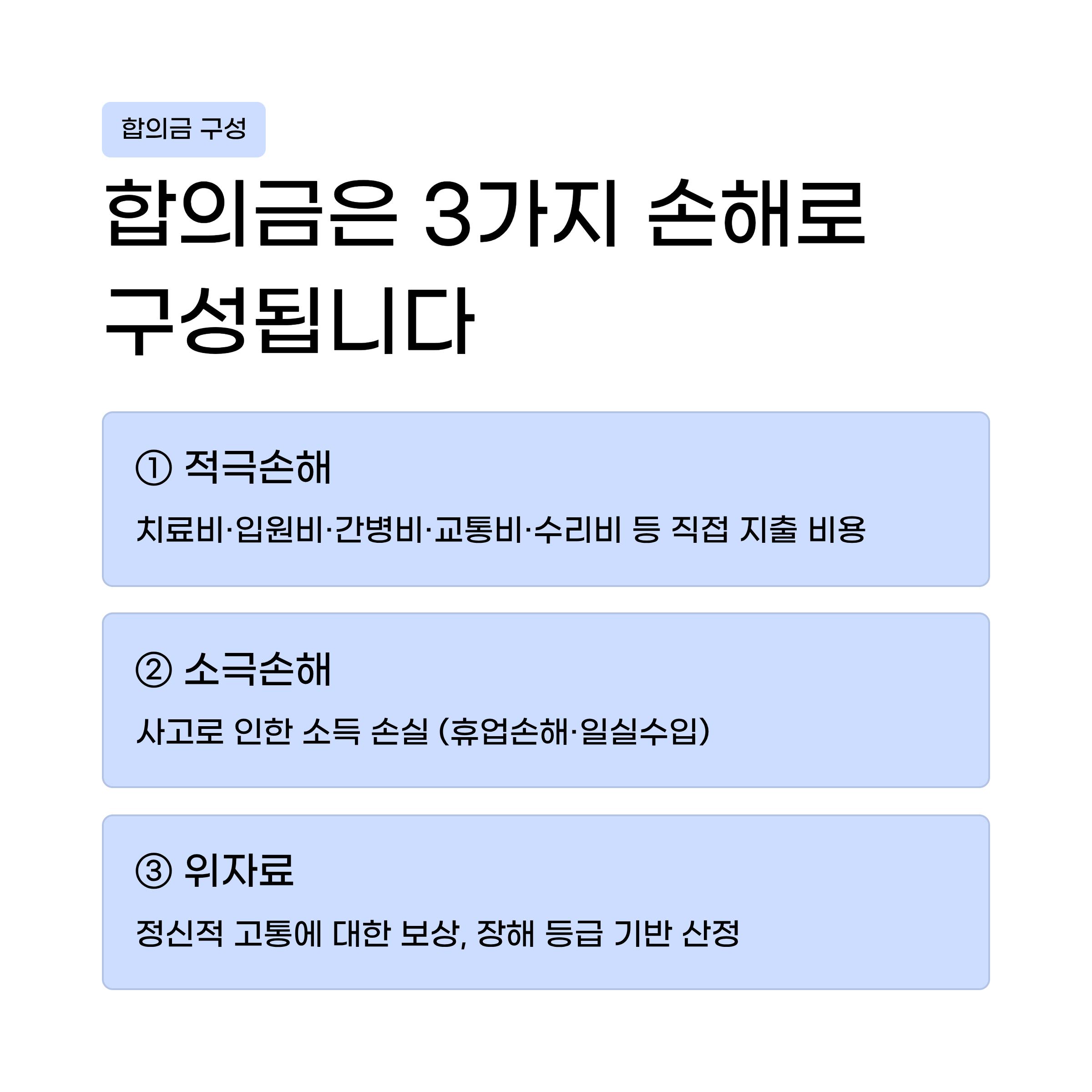 교통사고 합의금은 크게 적극손해, 소극손해, 위자료 세 가지로 구성됩니다. 항목별 금액을 먼저 산정한 뒤 과실비율을 적용해 최종 지급액이 결정됩니다.
