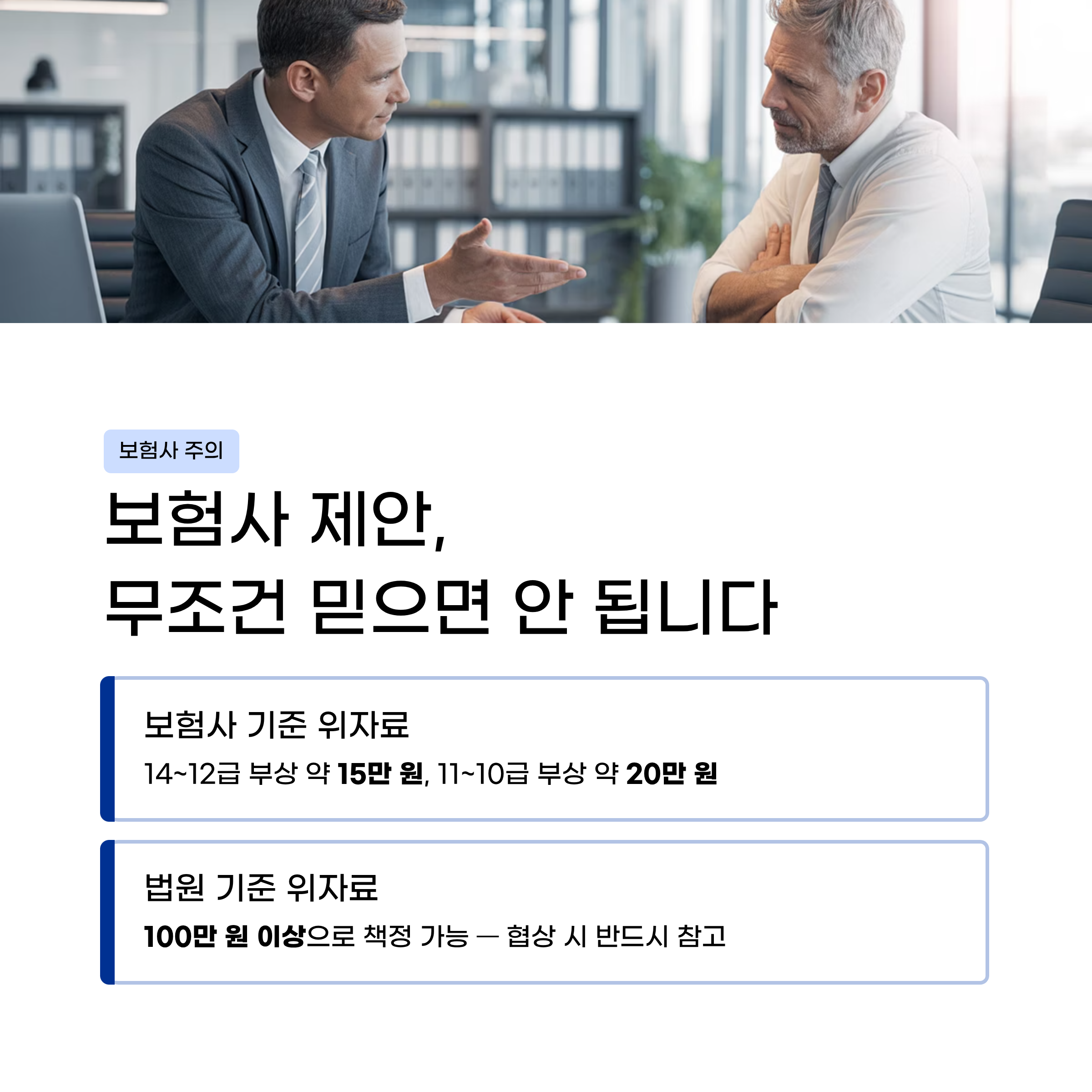 | 12~14급 부상 (경상) | 약 15만 원 | 100만 원 이상 가능 |