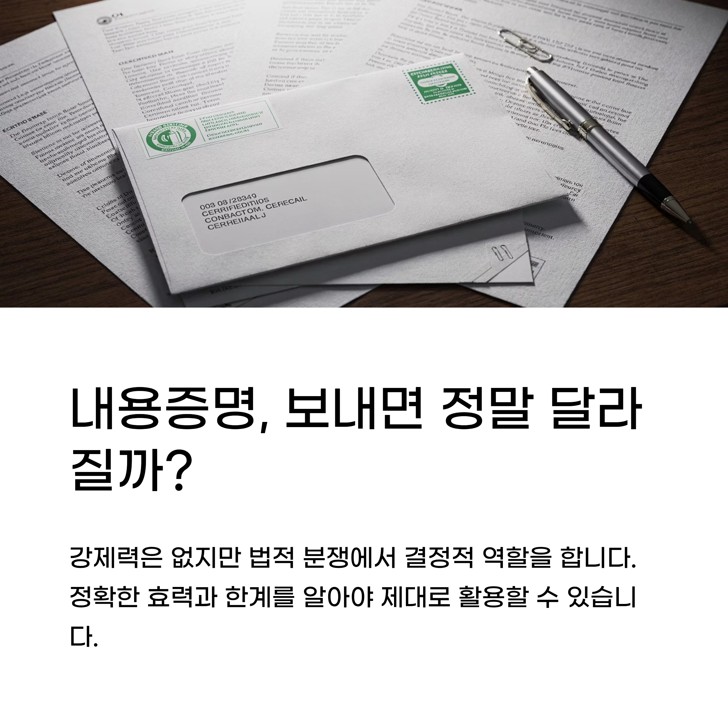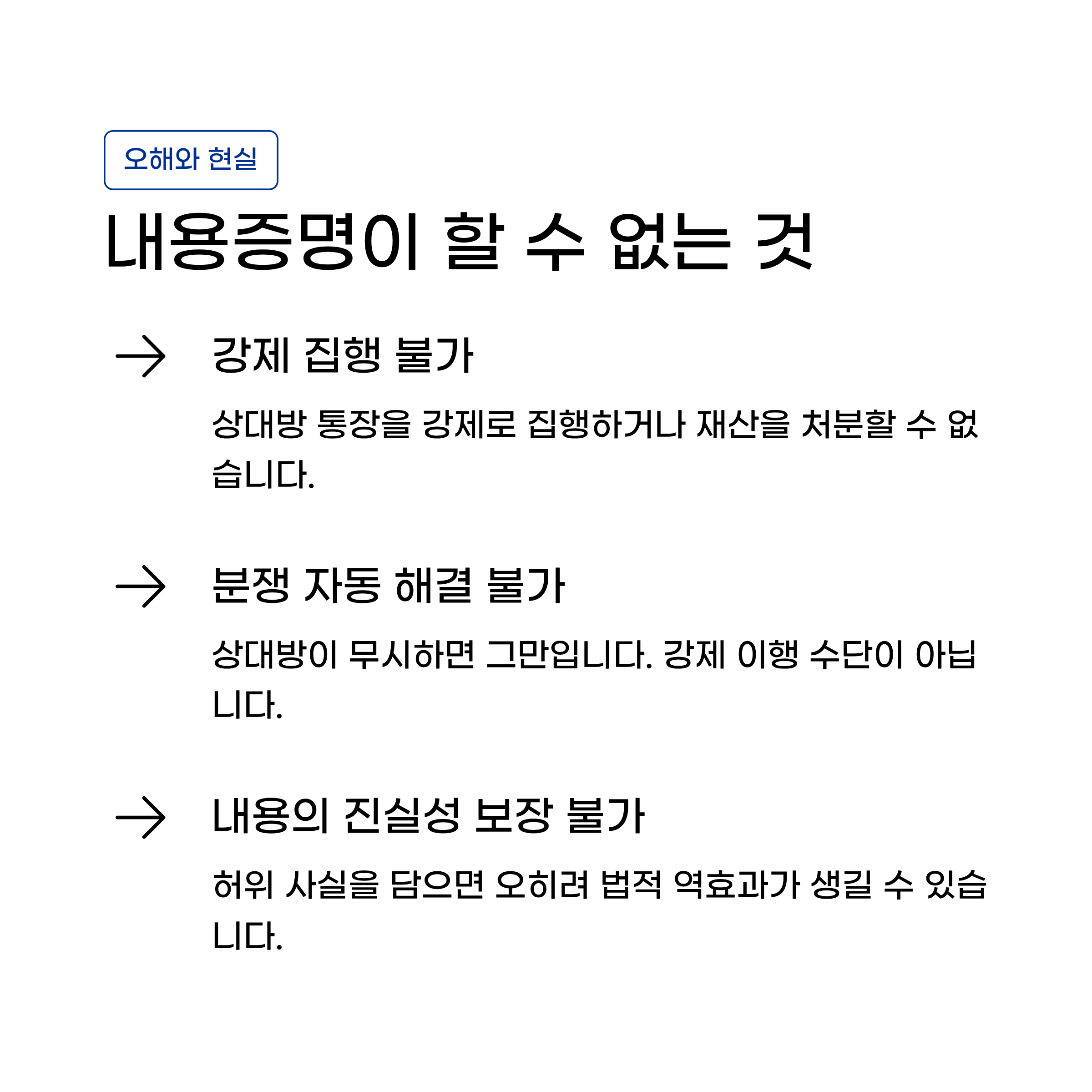 또한 내용증명 우편이 해당 기재 내용의 진실성까지 보장하는 것은 아니다. 발송한 내용이 사실이어야 효력이 있으며, 허위 사실을 담아 보내면 오히려 법적 역효과가 생길 수 있다.
