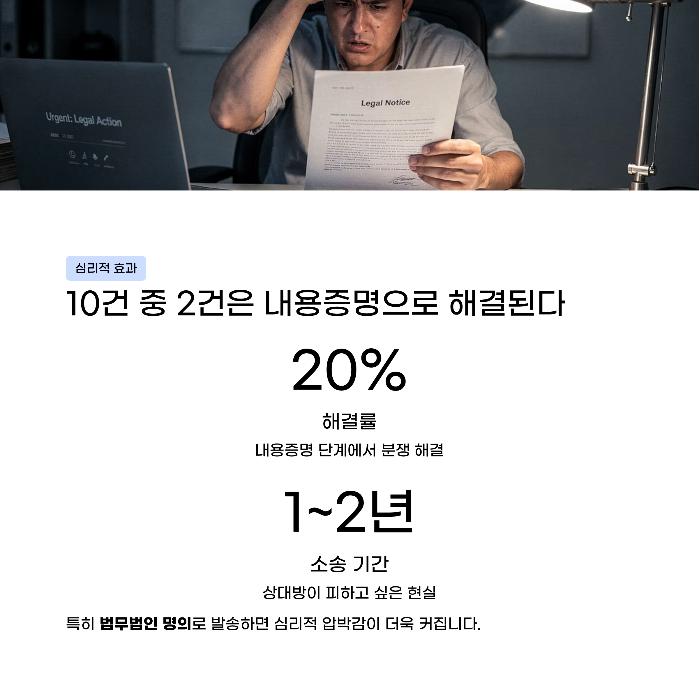 수백만 원의 소송 비용과 1~2년의 소송 기간을 피하고 싶은 상대방이 내용증명 한 장에 먼저 연락을 해오는 경우가 적지 않다. 특히 법무법인 명의로 발송하면 그 압박감은 더 커진다.