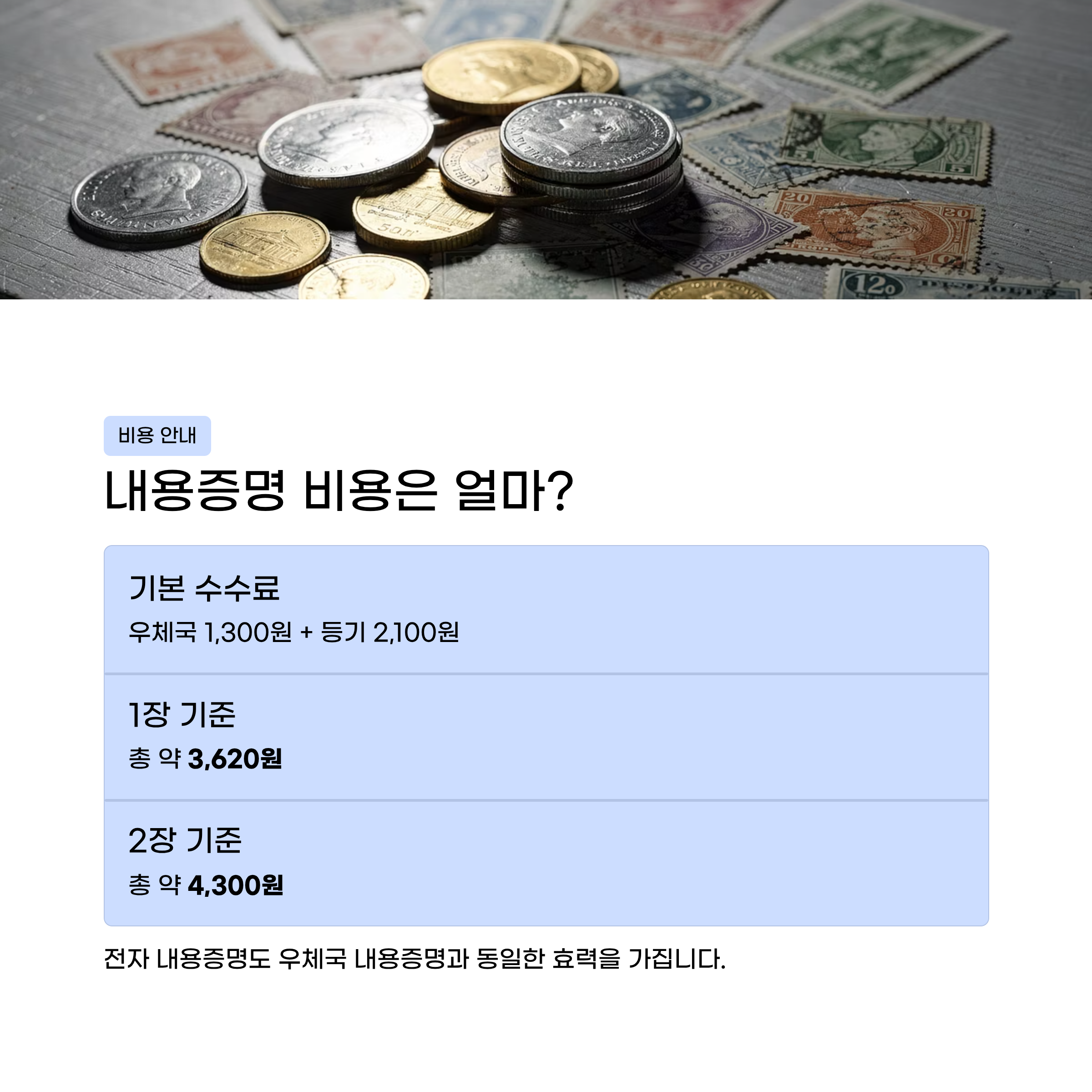 | 내용증명 수수료 (1매) | 1,300원 | 초과 1매당 650원 추가 |
