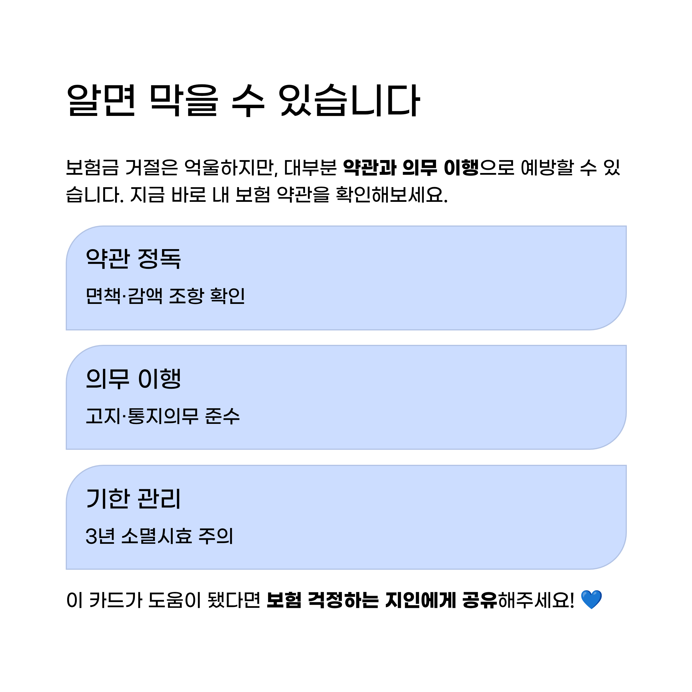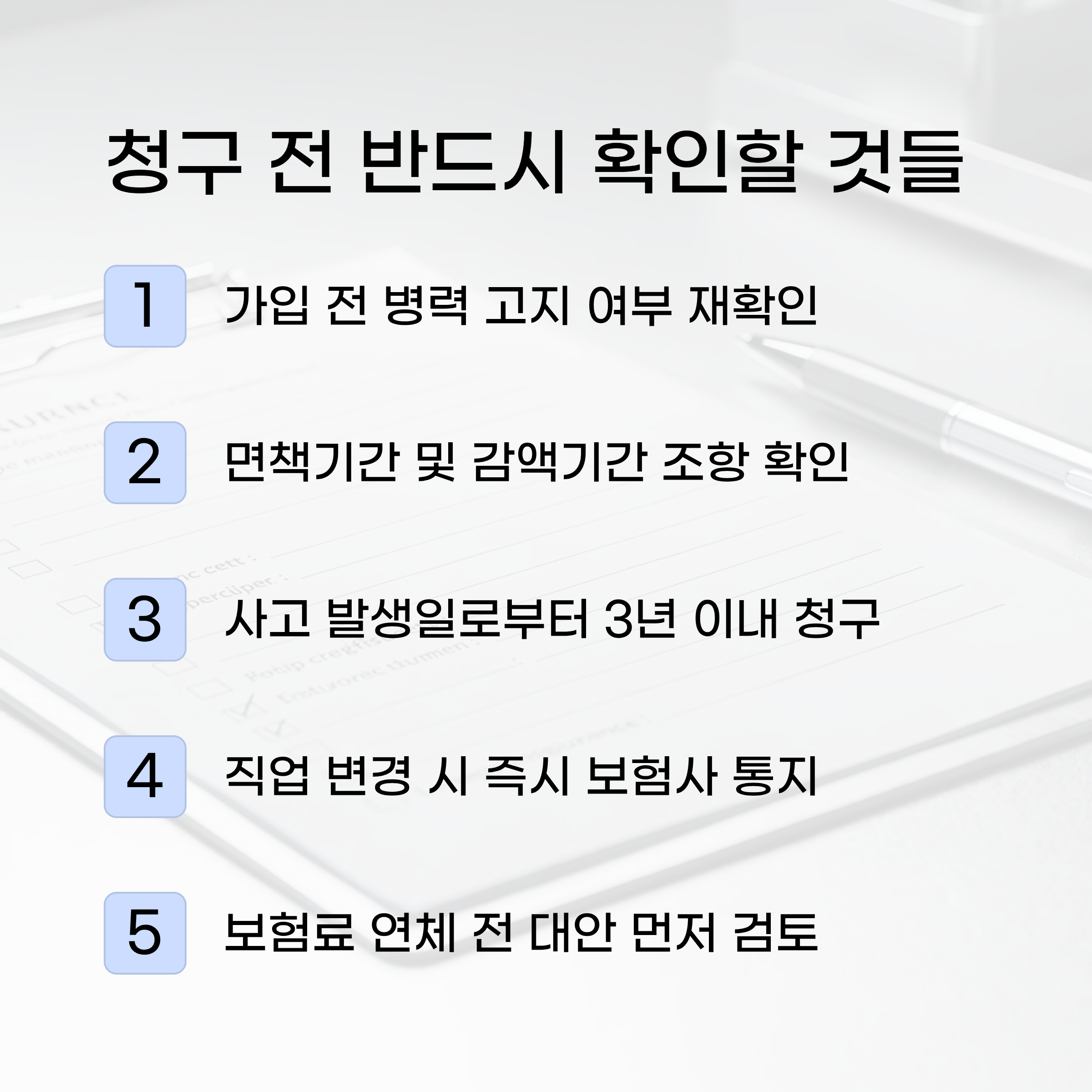 가장 중요한 것은 청약서 작성 시 병력을 정확하게 기재하고, 면책기간·소멸시효·직업 변경 신고 의무를 놓치지 않는 것입니다.