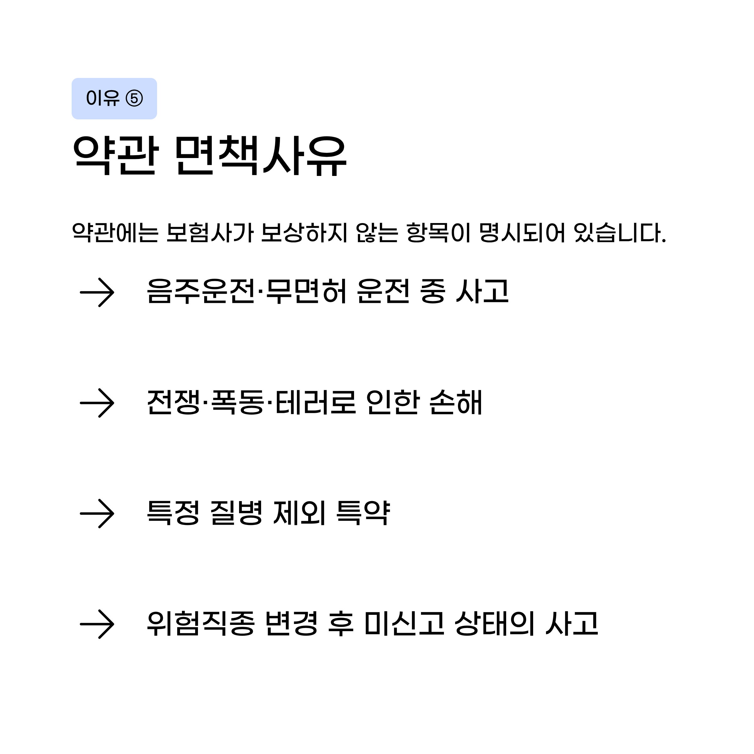 약관에는 보험사가 보상하지 않는 항목이 명시되어 있습니다. 대표적인 면책사유입니다.