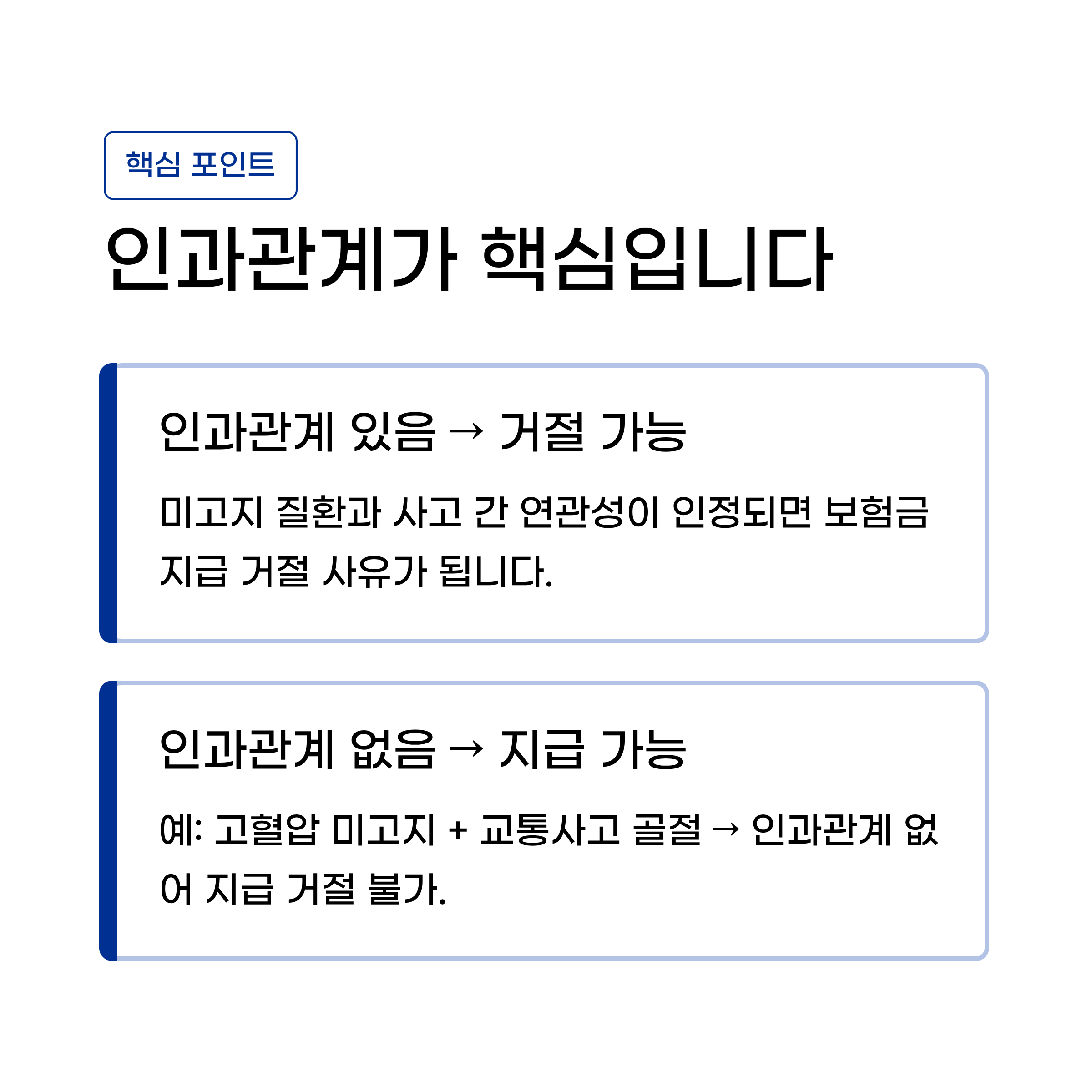 보험금 지급 거절 사유 중 가장 빈번한 것이 고지의무 위반입니다. 가입 전 병원 진료 이력이나 치료 사실을 정확히 알리지 않은 경우, 보험사는 계약 해지 또는 보험금 지급 거절을 통보할 수 있습니다.