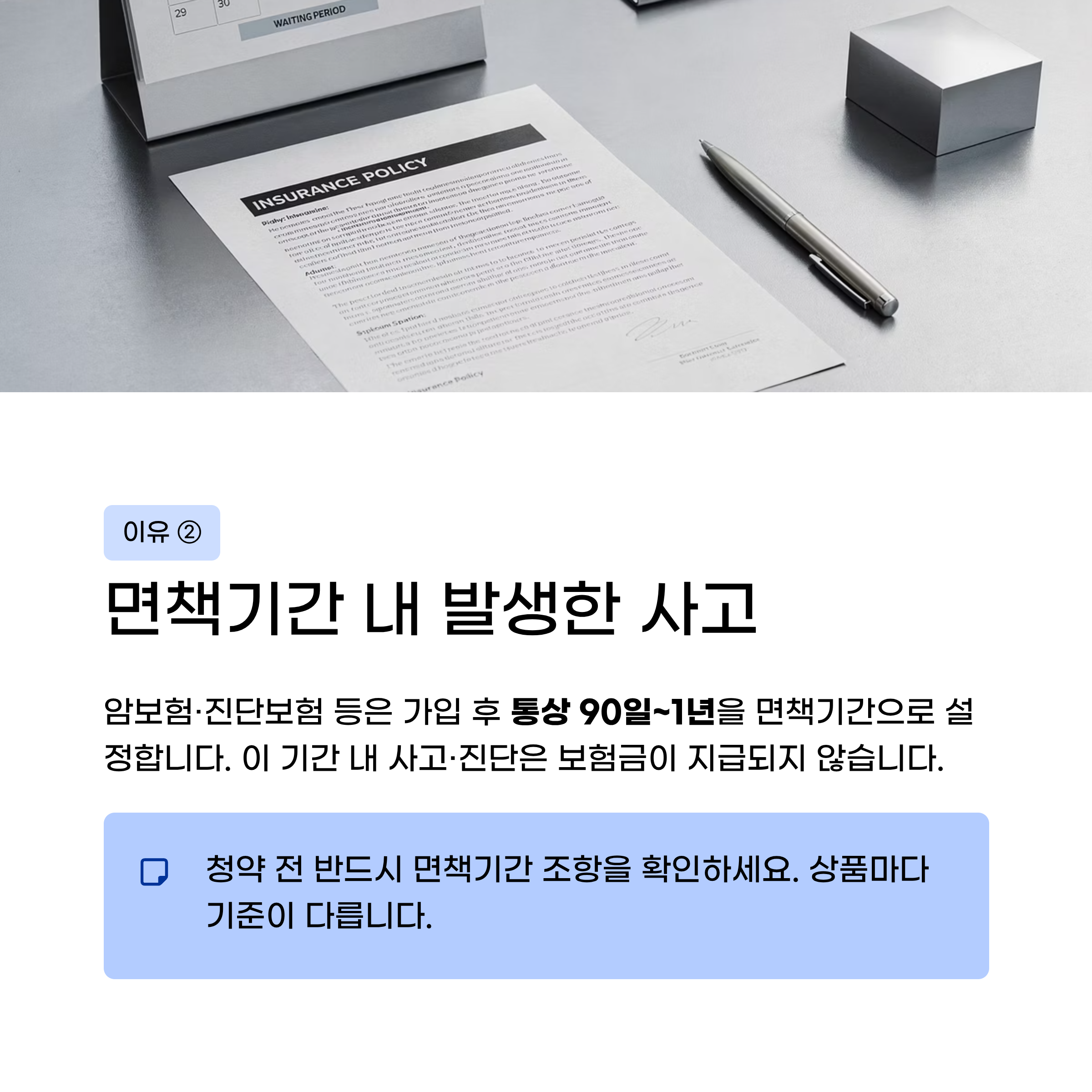 암보험, 진단보험 등 상당수 상품은 가입 후 일정 기간(통상 90일~1년)을 면책기간으로 설정합니다. 이 기간 내에 발생한 사고나 진단은 보험금을 지급하지 않습니다.