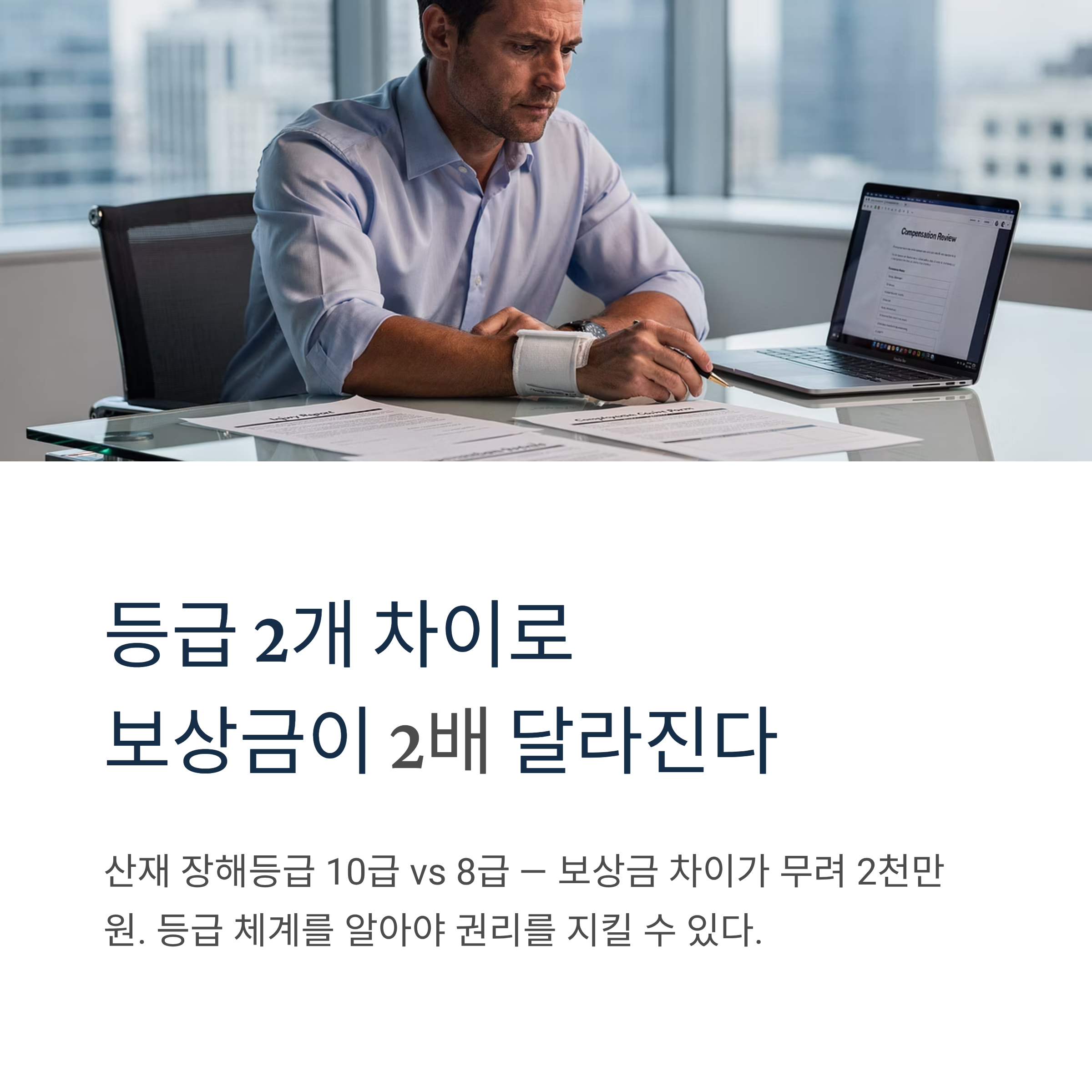 평균임금이 10만 원인 근로자가 장해등급 10급을 받으면 약 2,240만 원이지만 8급을 받으면 약 4,950만 원의 장해보상을 받는다. 1등급 차이라도 보상금은 천지차이다.