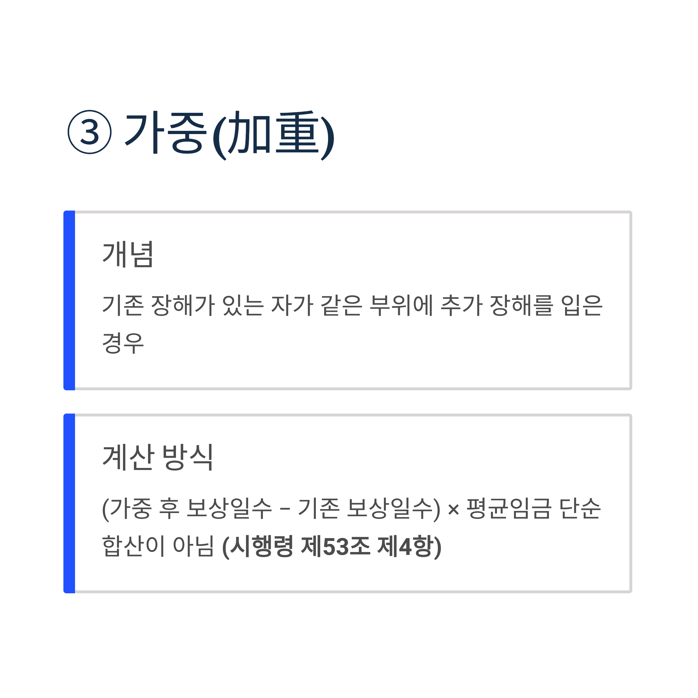 이미 신체장해가 있었던 자가 업무상 재해로 인해 같은 부위에 장해의 정도가 가중한 경우 가중한 한도에서 장해보상을 행하는 것이다. 기존 장해의 보상일수를 차감한 만큼만 추가 지급된다.