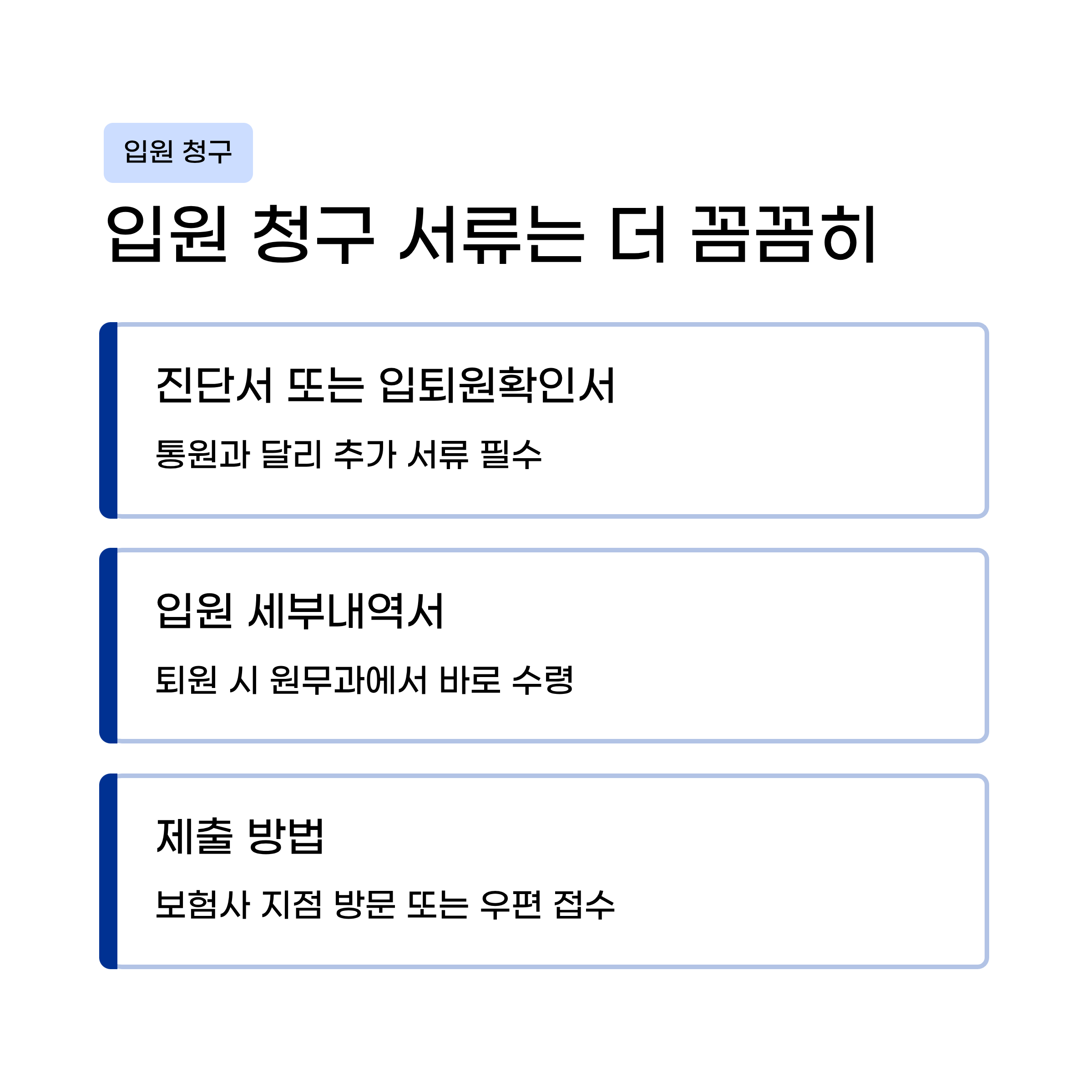 | 입원 치료 | 영수증 + 입퇴원확인서(50만 원 이하) 또는 진단서 + 세부내역서 |