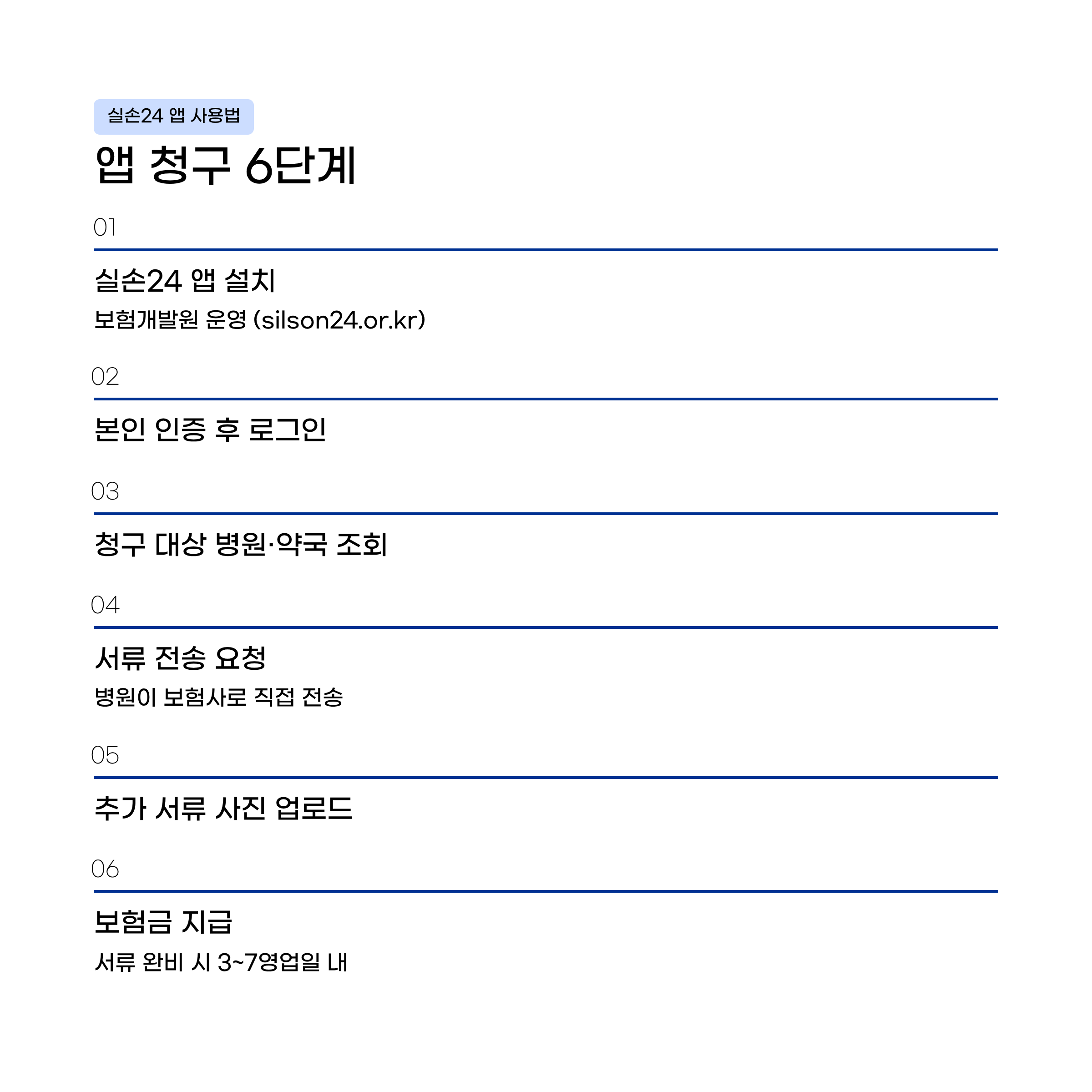 앱스토어 또는 플레이스토어에서 '실손24' 검색 후 설치. 공식 사이트: www.silson24.or.kr
