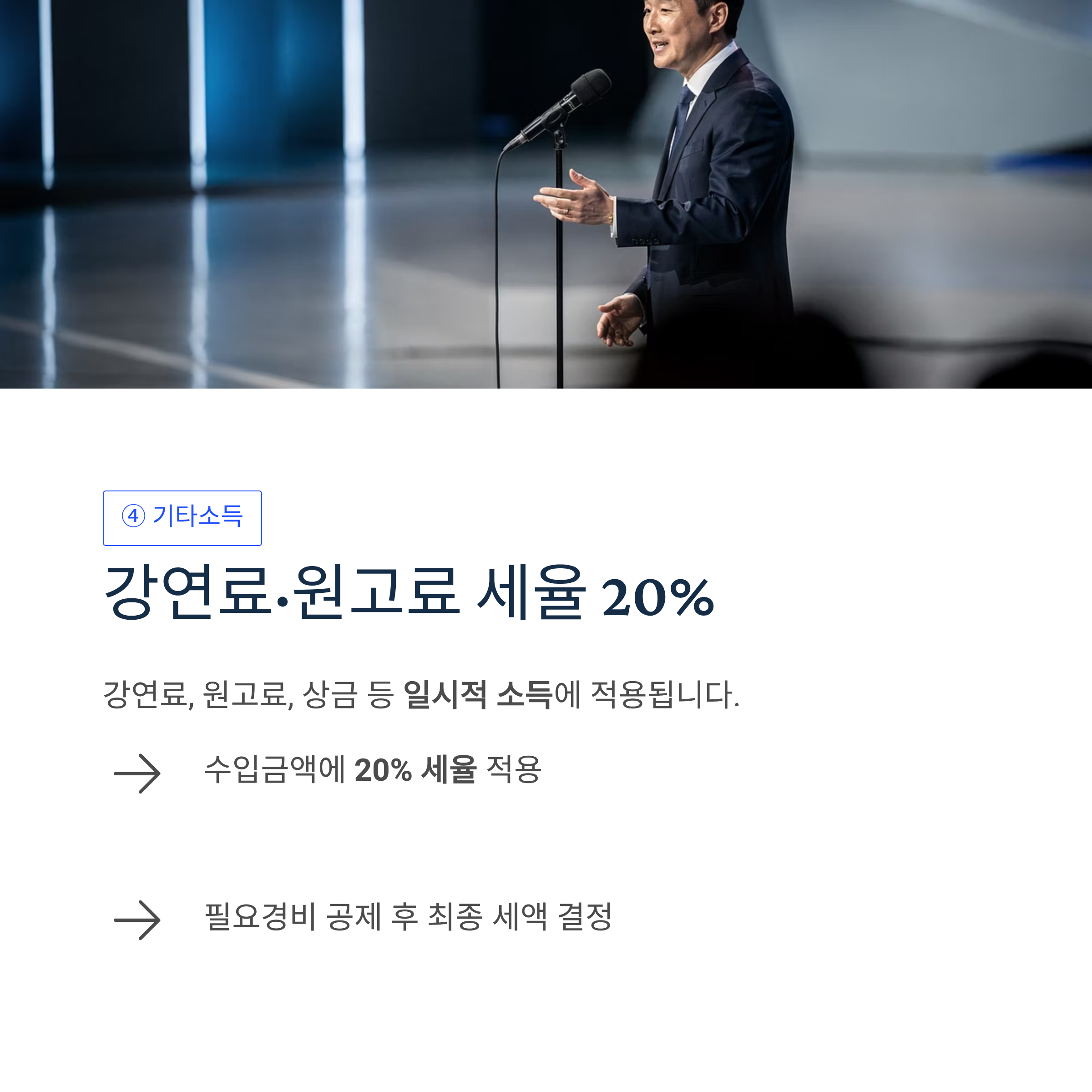 - 🎤기타소득 — 필요경비(60%) 공제 후 20% 적용. 실제 체감 세율은 수입의 약 8%
