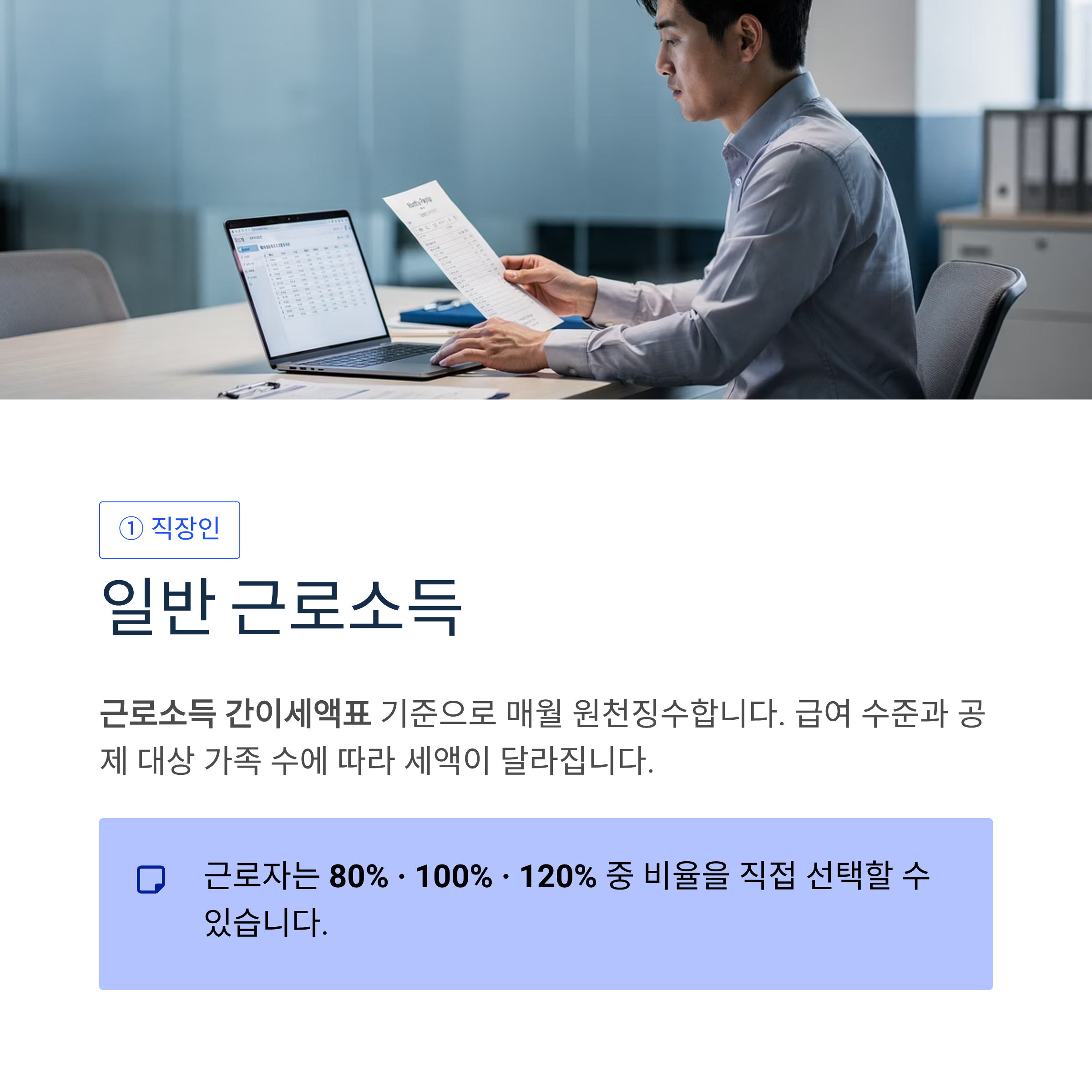 - 💼일반 근로자 — 근로소득 간이세액표 기준. 근로자가 80%·100%·120% 중 세액 비율 직접 선택 가능