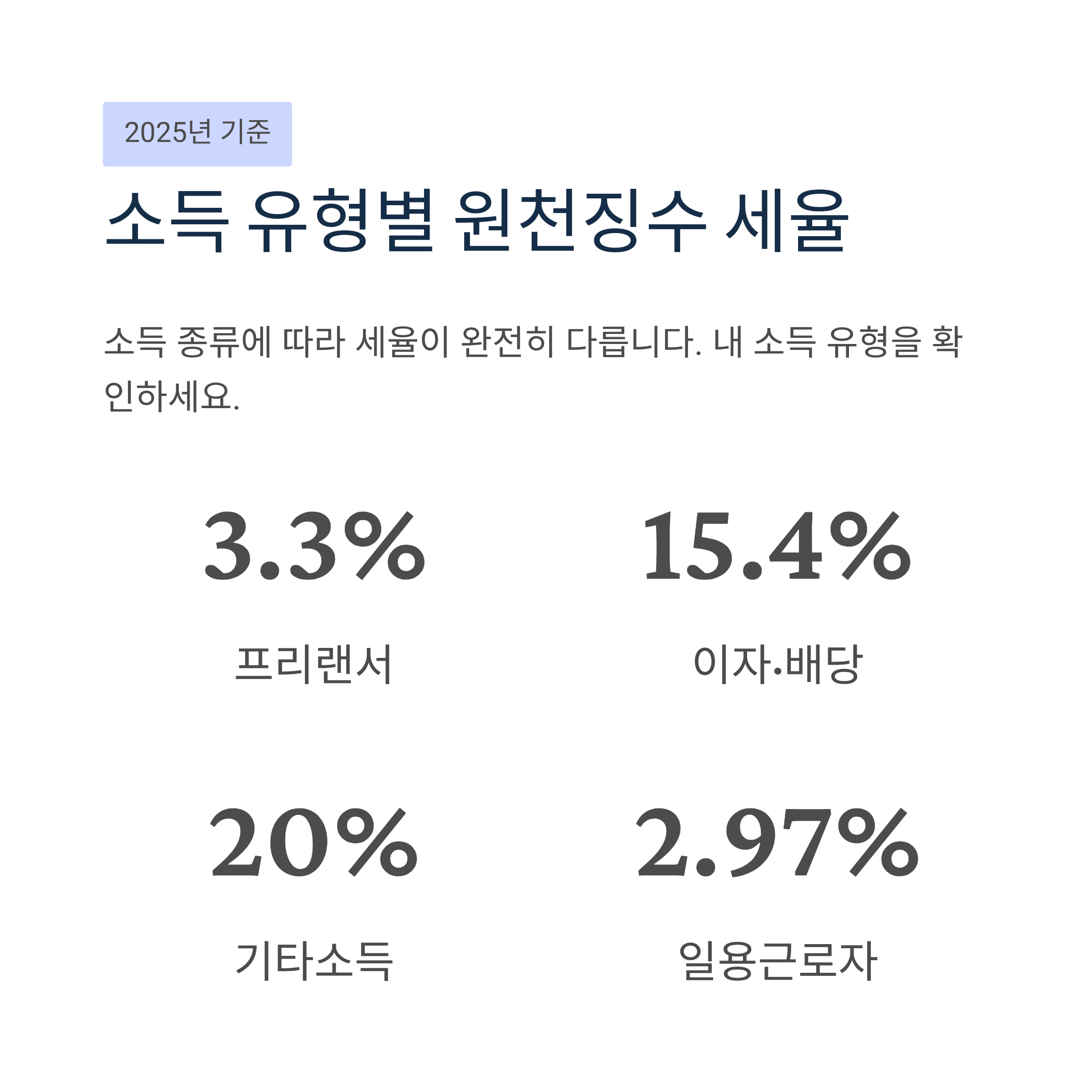 🏛️ 국세청 공식 원천징수 제도 안내 바로가기 nts.go.kr — 근로소득 원천징수 공식 기준 확인소득 유형별 원천징수 세율 (2025년 기준)