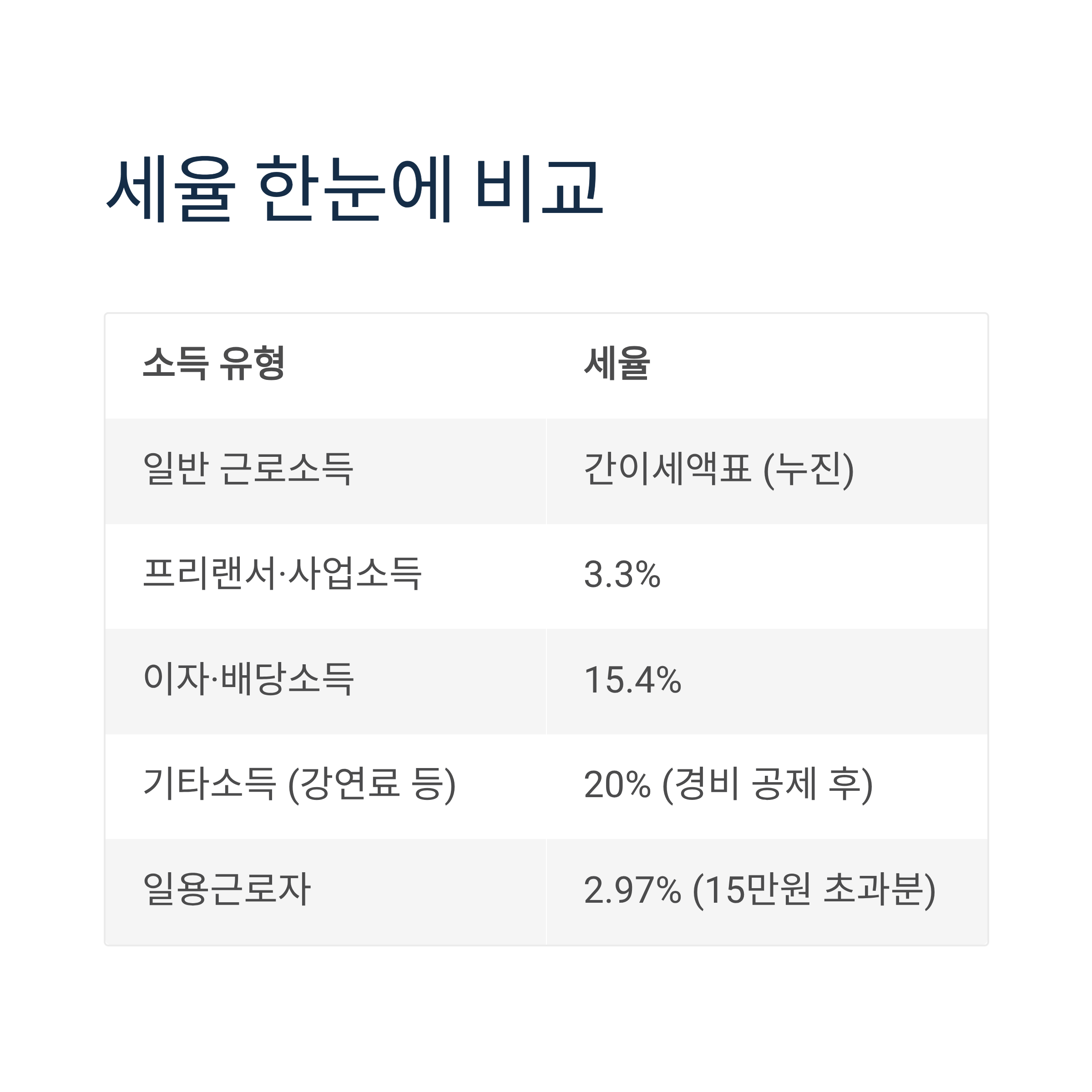 소득 종류에 따라 적용되는 세율이 완전히 다릅니다. 본인의 소득 유형을 먼저 확인하세요.