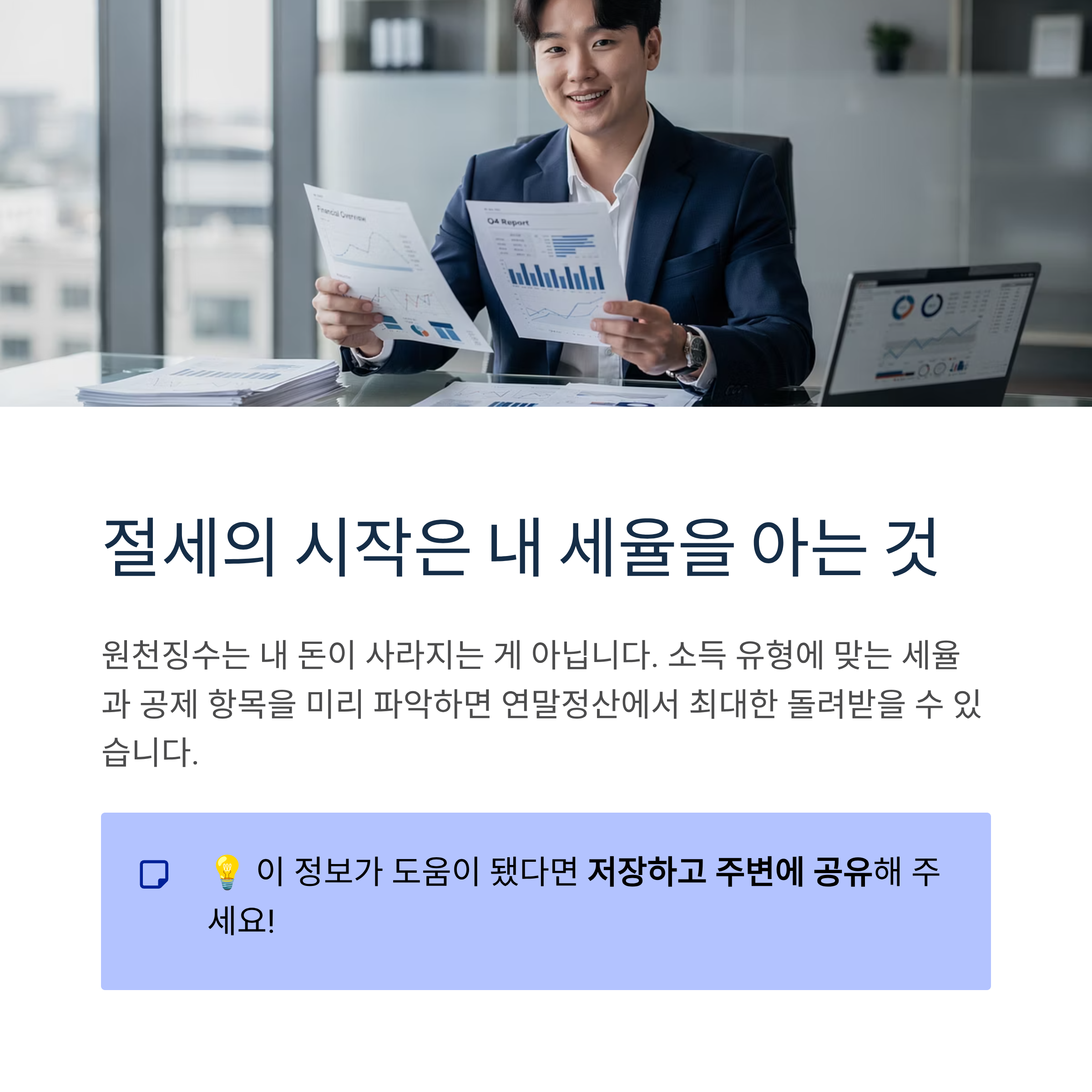 원천징수는 내 돈이 영영 사라지는 게 아닙니다. 연말정산·종합소득세 신고를 통해 더 낸 세금은 반드시 돌려받을 수 있으므로, 본인의 소득 유형에 맞는 세율과 공제 항목을 미리 파악해두는 것이 절세의 시작입니다.