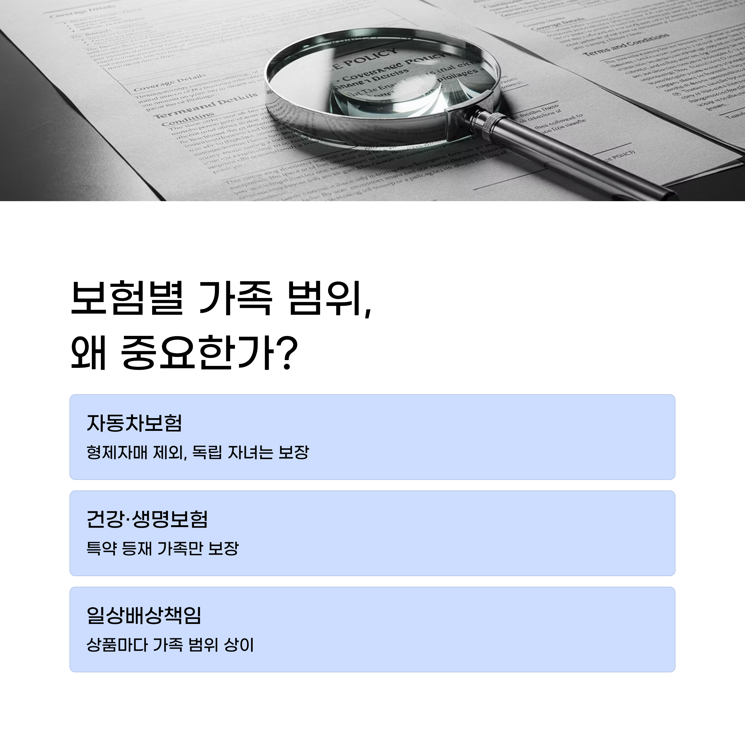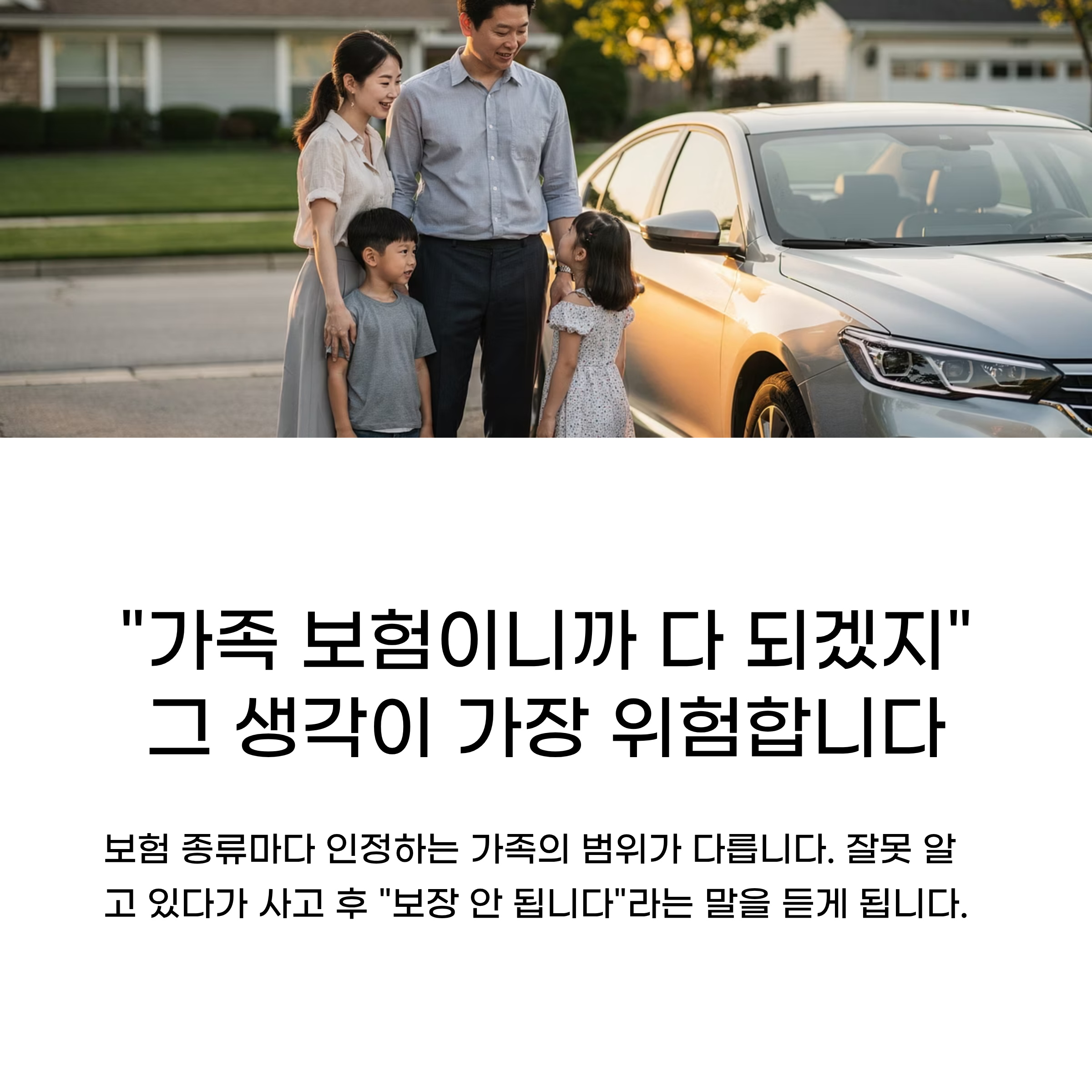 보험에 '가족'이라고 되어 있어도 모든 가족이 보장되는 건 아니다. 형제자매는 '가족'이지만 자동차보험 가족한정에선 제외되고, 독립한 자녀는 같은 집에 살지 않아도 보장된다. 보험 종류마다 인정하는 가족의 범위가 다르다. 잘못 알고 있다가 사고가 났을 때 "이분은 보장 안 됩니다"라는 말을 듣게 된다.