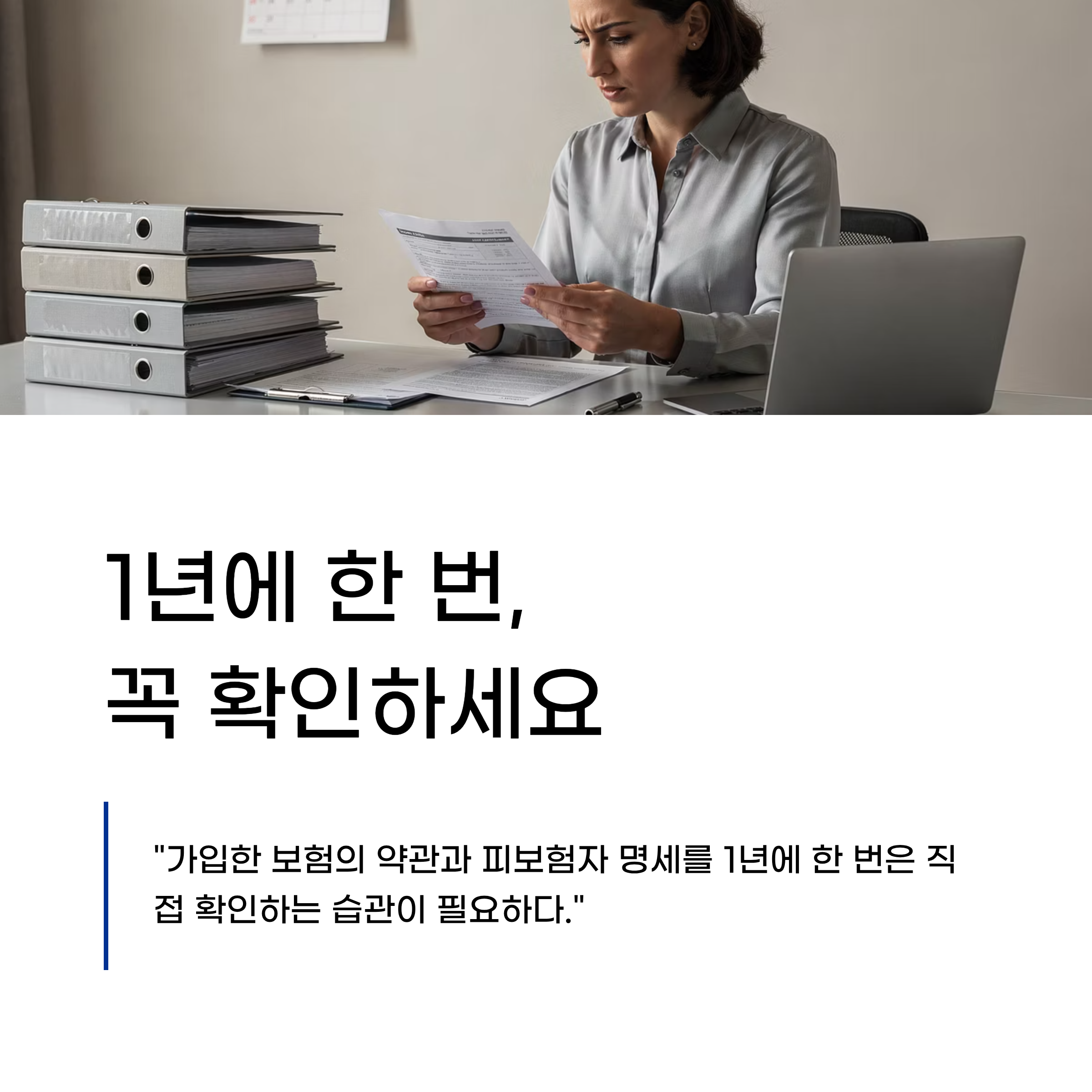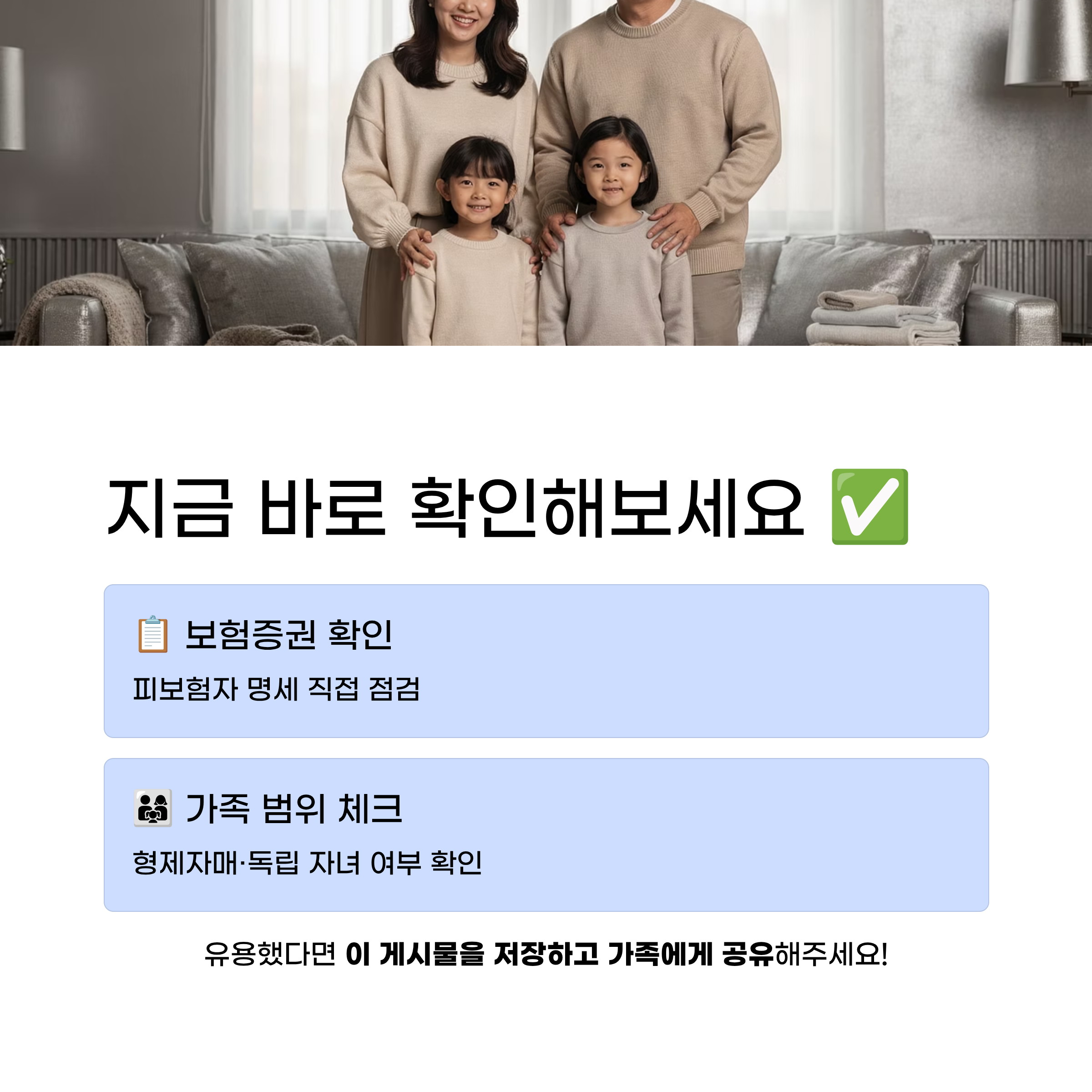 "가족 보험이니까 다 되겠지"라는 생각이 가장 위험하다. 가입한 보험의 약관과 피보험자 명세를 1년에 한 번은 직접 확인하는 습관이 필요하다. 가족 구성원이나 거주지 변화가 생겼을 때도 즉시 보험사에 알려야 불이익을 막을 수 있다.📌 안내사항