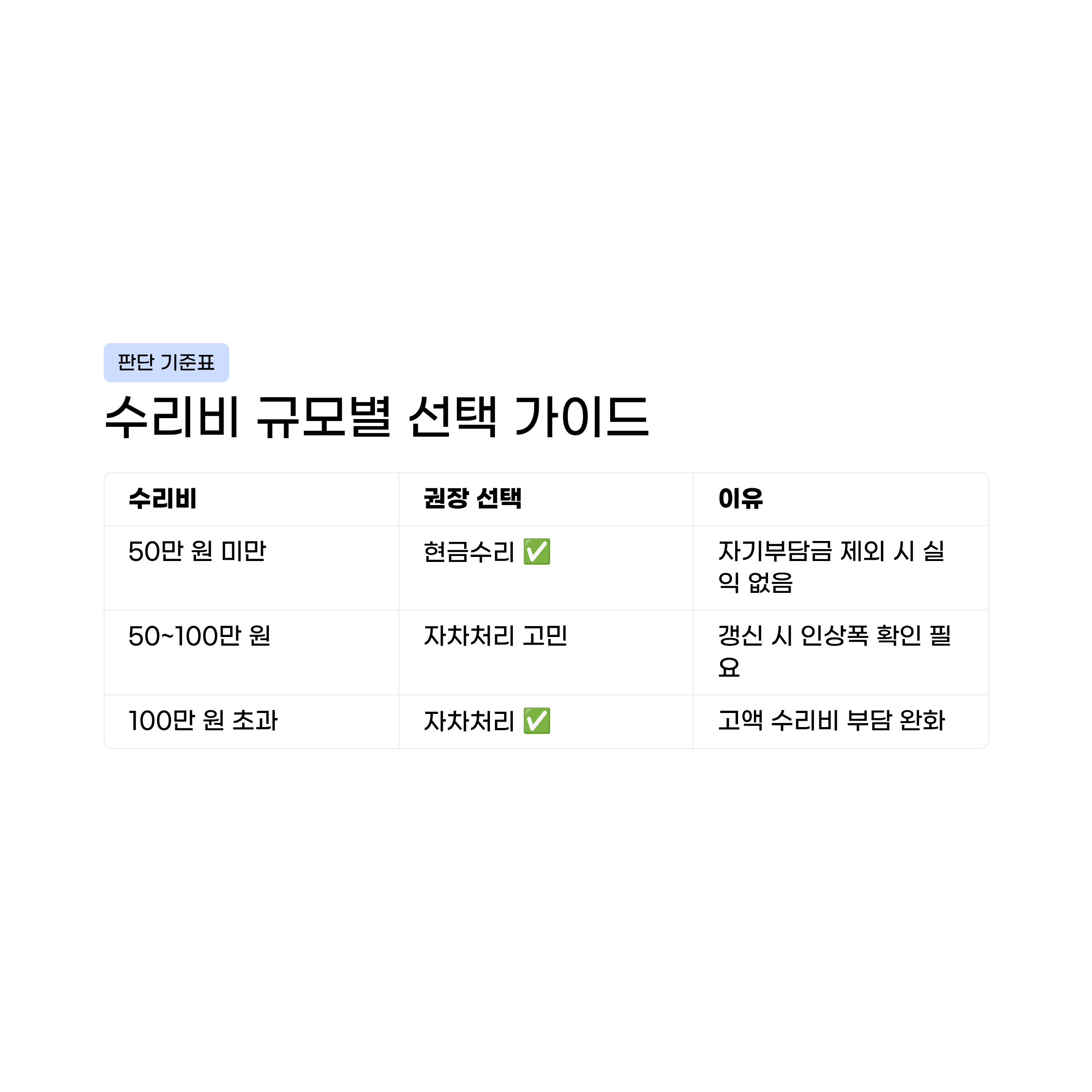 | 수리비 규모 | 50만 원 미만 | 100만 원 초과 |