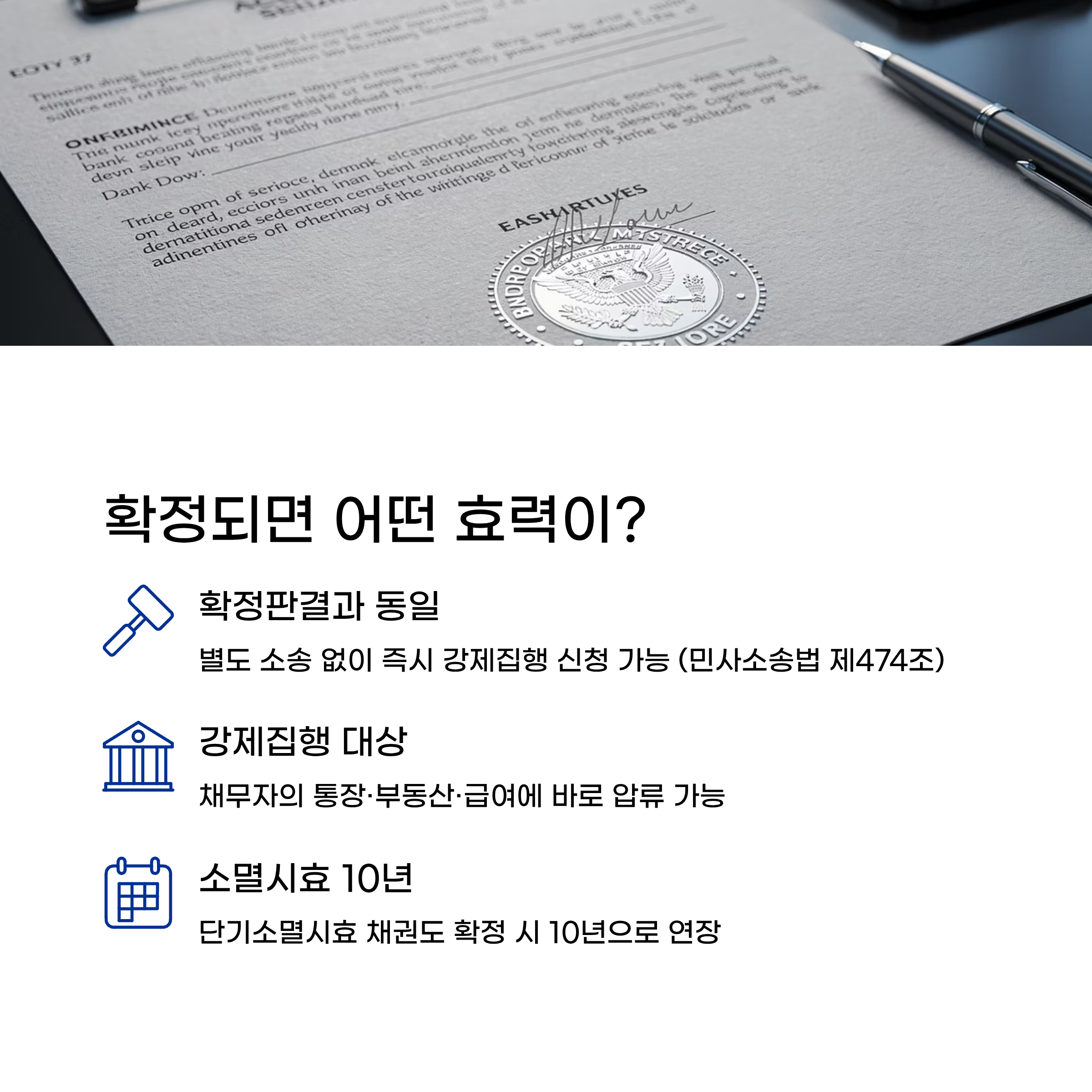 즉, 이의신청 없이 확정되면 별도의 소송 없이 채무자 재산에 바로 강제집행을 신청할 수 있다.