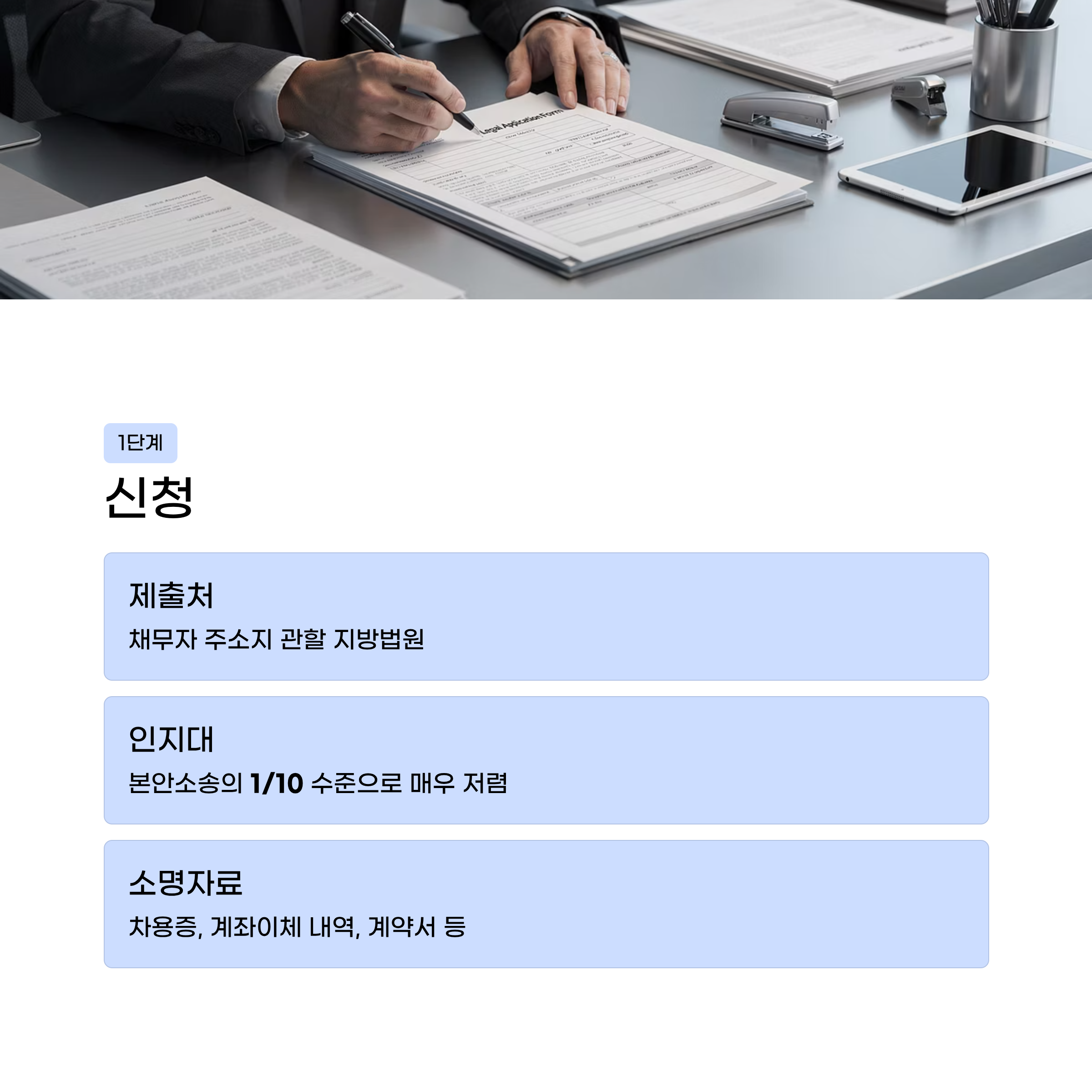 채무자 주소지 관할 지방법원에 지급명령 신청서와 차용증·계좌이체 내역 등 소명자료를 제출한다. 인지대는 본안소송의 1/10 수준으로 매우 저렴하다.
