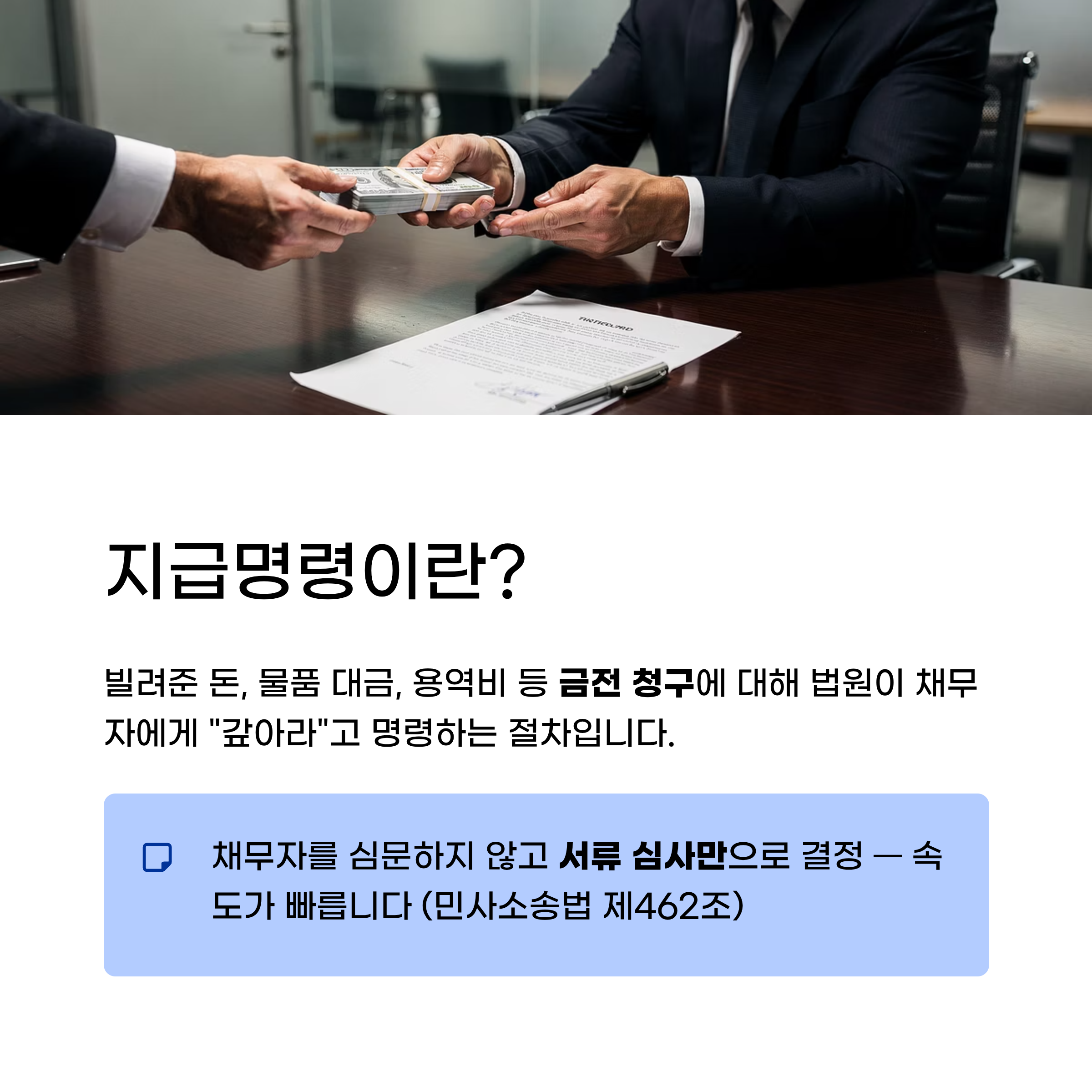 쉽게 말해 빌려준 돈, 물품 대금, 용역비 등 금전 청구에 대해 법원이 채무자에게 "갚아라"는 명령을 내리는 절차다. 일반 소송과 달리 법원이 채무자를 심문하지 않고 서류 심사만으로 결정하기 때문에 속도가 빠르다.