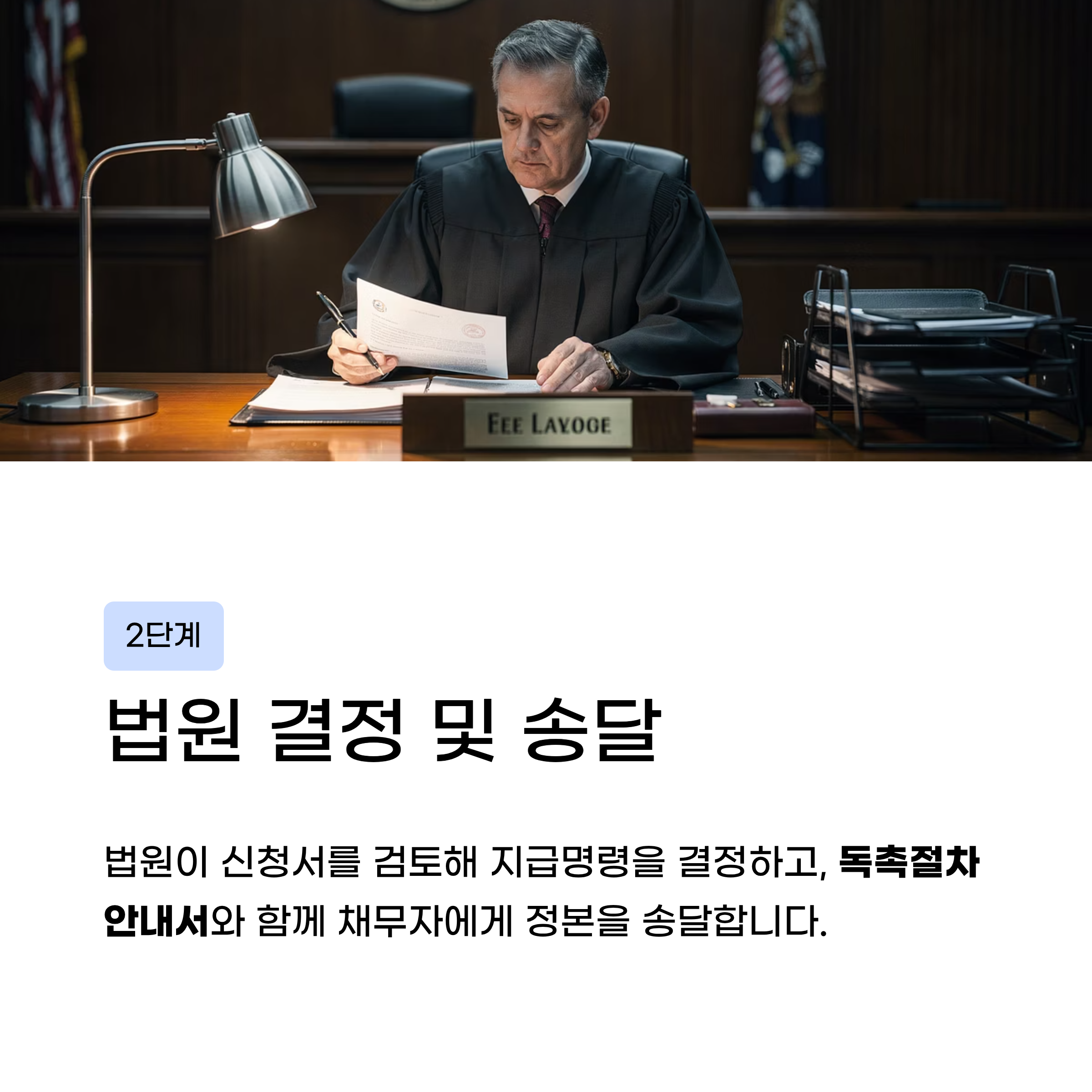 법원이 신청서를 검토해 지급명령을 결정하고 채무자에게 정본을 독촉절차안내서와 함께 송달한다.