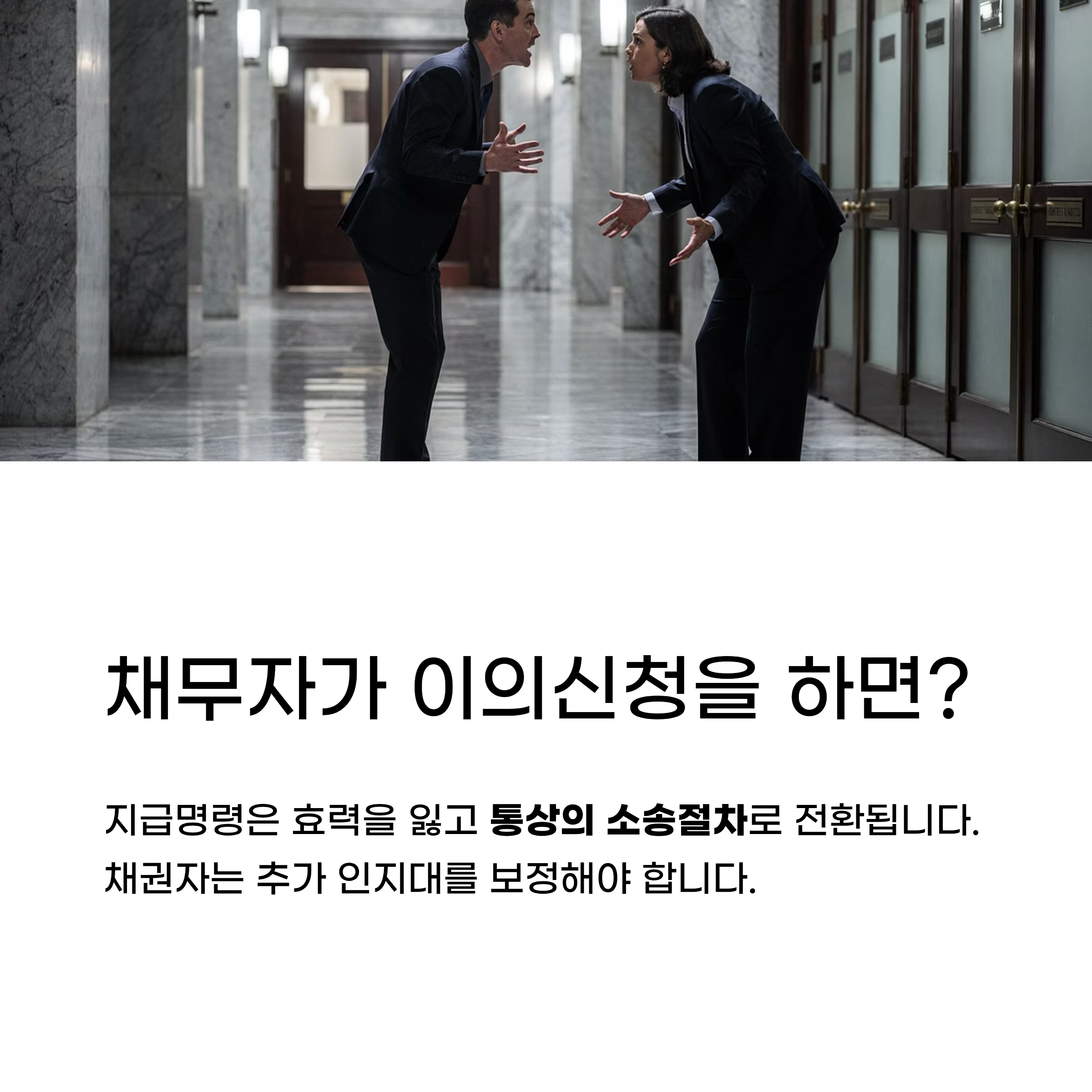 현실적으로 채무자가 이의신청을 하는 경우가 많다. 이때 절차가 어떻게 달라지는지 알아야 한다.