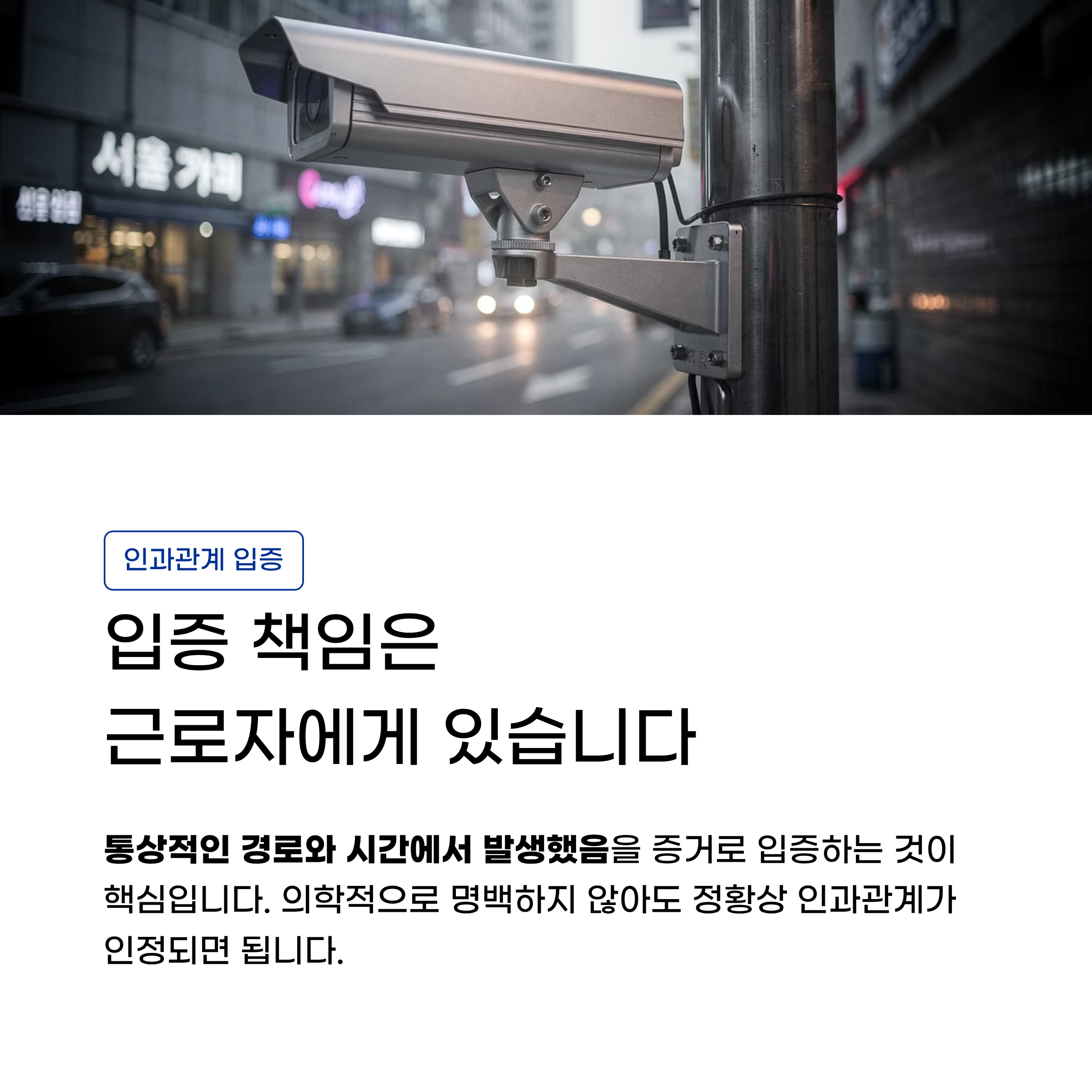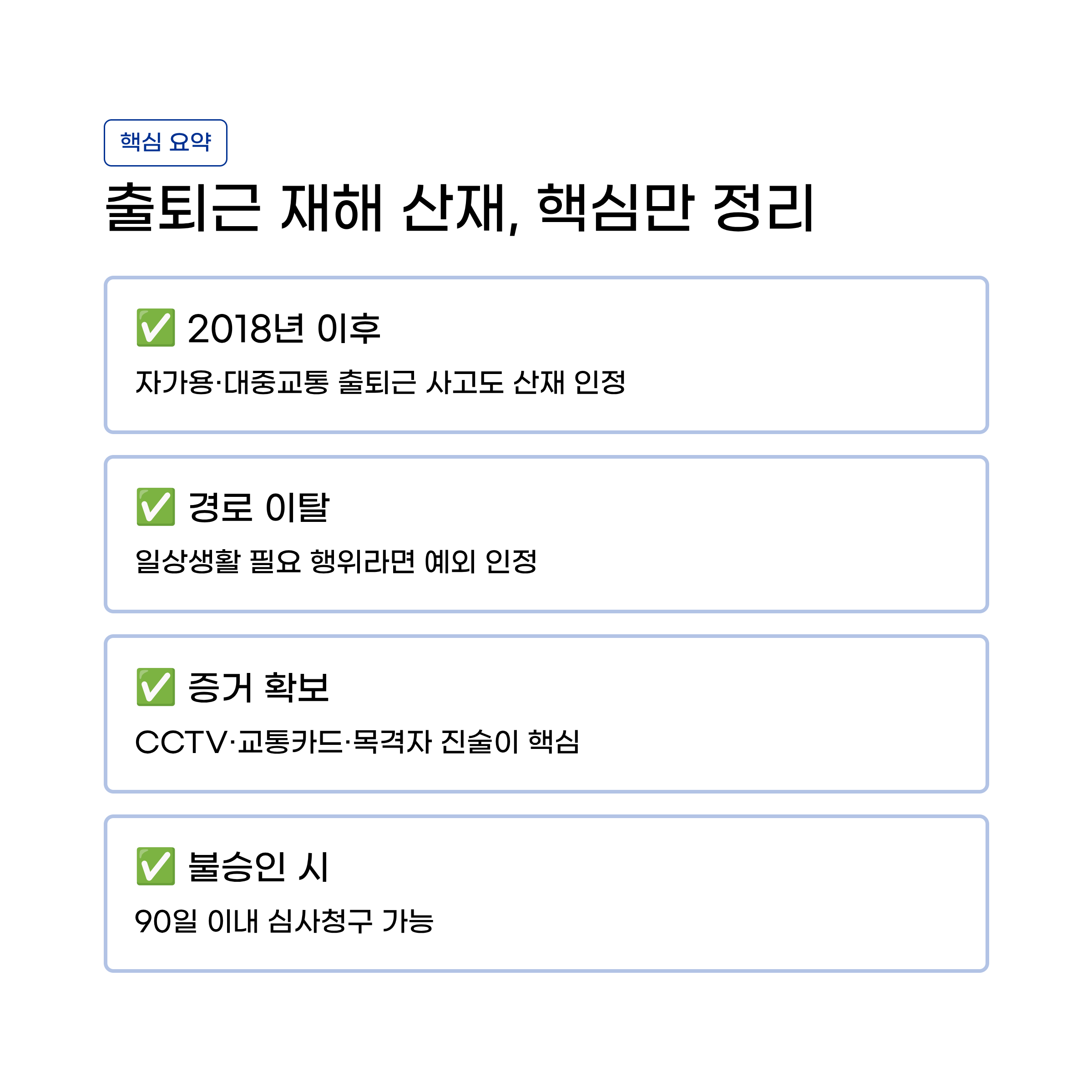 출퇴근 재해의 경우 통상적인 경로와 시간에서 발생했음을 증거로 입증하는 것이 핵심이다.