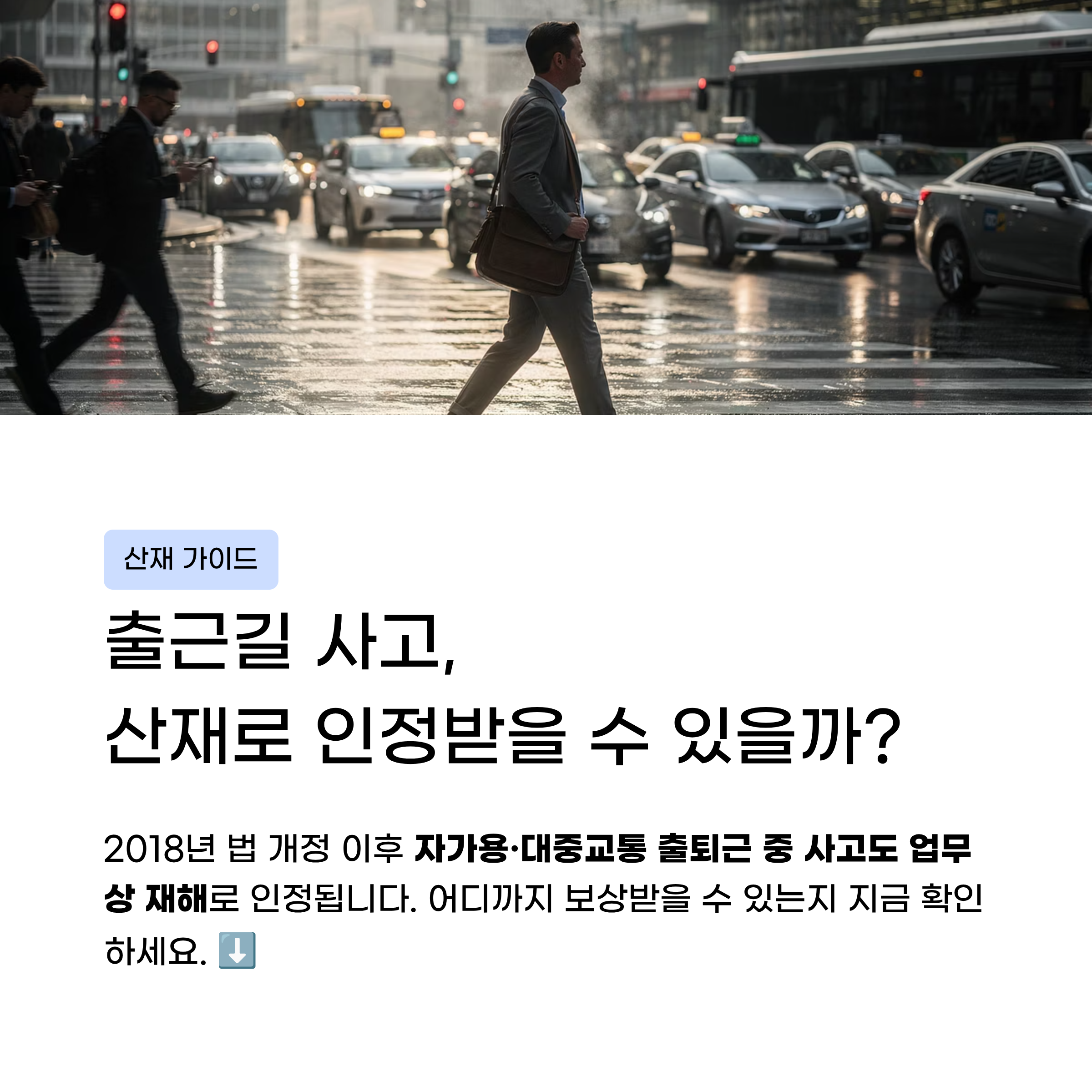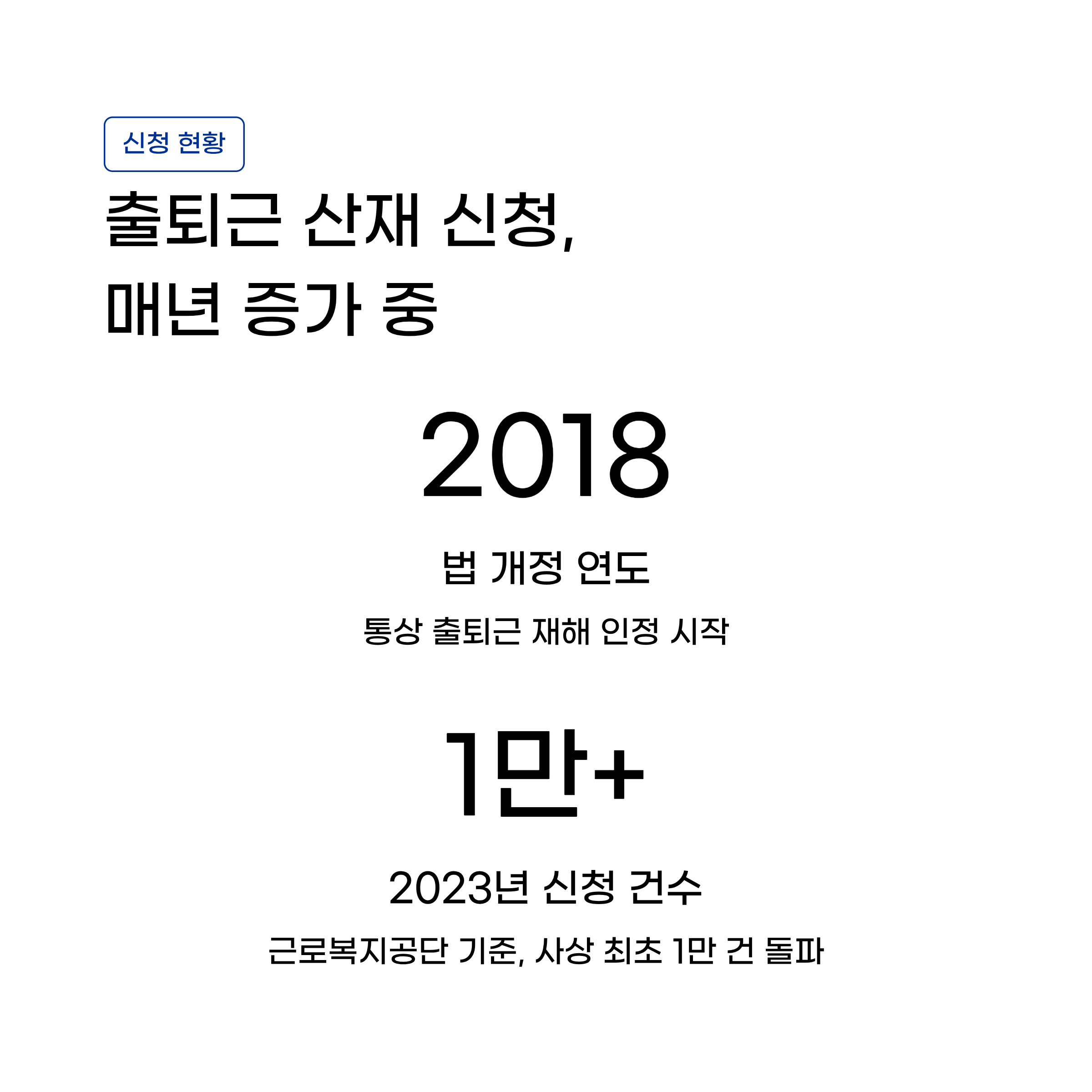 2018년 1월 1일 산업재해보상보험법이 개정됨에 따라 사업주의 지배관리 하의 출퇴근 재해뿐 아니라 통상의 출퇴근 시 일어난 사고까지 업무상 재해로 인정받게 되었다.