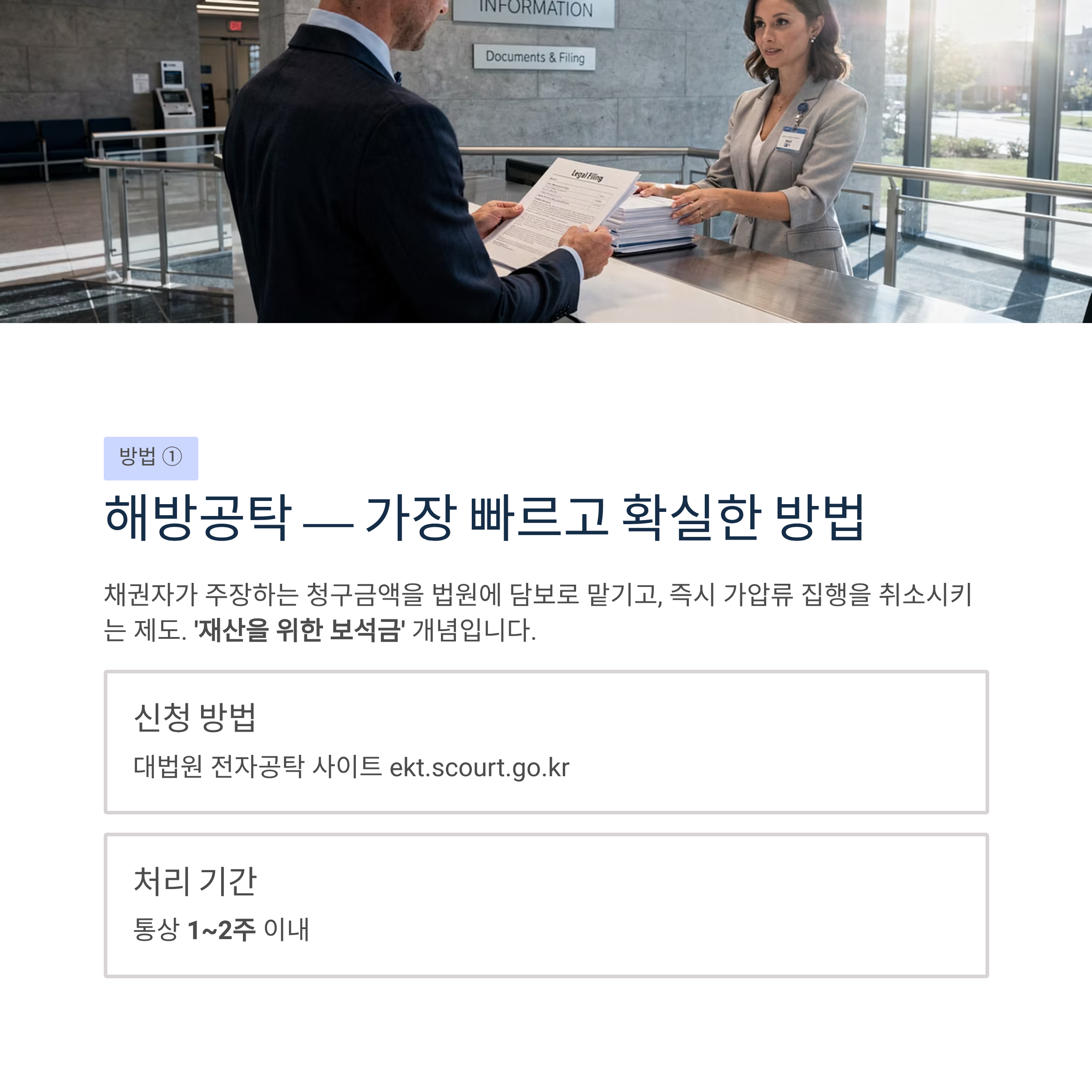 해방공탁은 가장 빠르고 확실하게 가압류에서 해방될 수 있는 방법입니다. 채권자가 주장하는 청구금액 전액을 법원에 담보로 맡기고, 즉시 가압류 집행을 취소시키는 제도입니다. 쉽게 말해 '재산을 위한 보석금' 같은 개념입니다. 대법원 전자공탁 사이트(ekt.scourt.go.kr)를 통해 온라인 신청이 가능합니다.