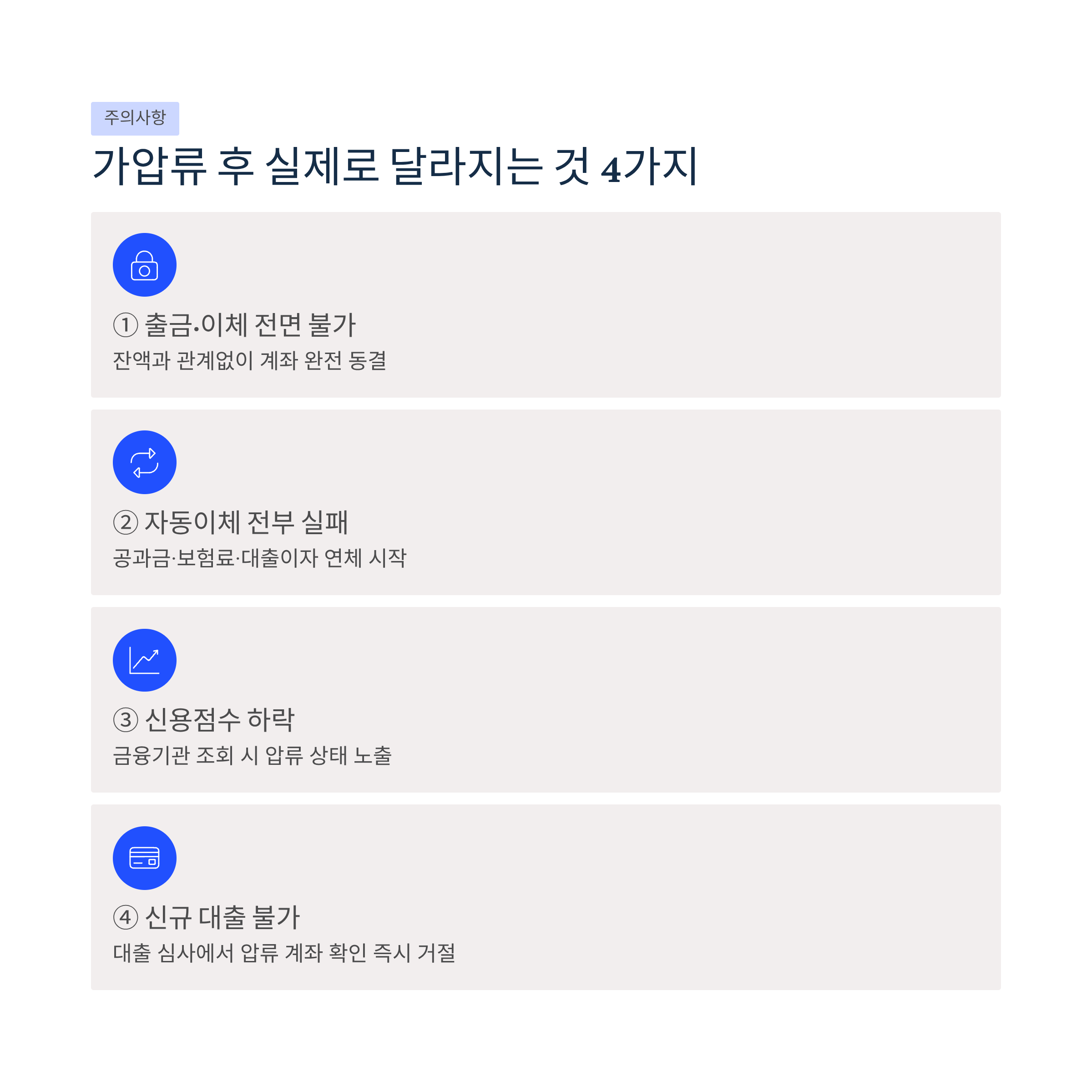 채무자는 해당 계좌에서 단 1원도 인출을 해올 수 없는 상황에 처하게 됩니다. 압류 사실은 신용조사 기관이나 은행 등에서 조회가 되는 상태가 됩니다. 가압류 통보를 받는 즉시 아래 4가지 영향을 확인하세요.